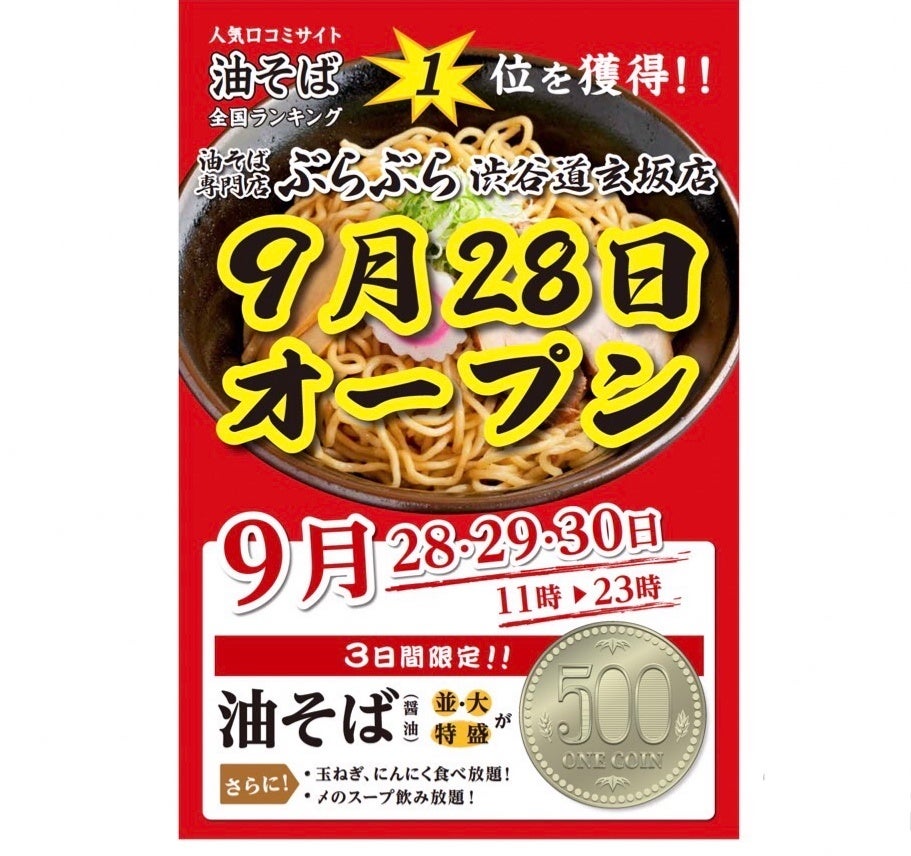 神奈川・東京・愛知などで12店舗を展開する油そば専門店「ぶらぶら」(株式会社高関食品、神奈川県横浜市)は9月28日(水)、渋谷エリア初出店となる油そば専門店「ぶらぶら」渋谷道玄坂店(東京都渋谷区)を開業いたします。28日・29日・30日は油そば(醤油)を特盛まで500円で提供するキャンペーンも実施いたします。