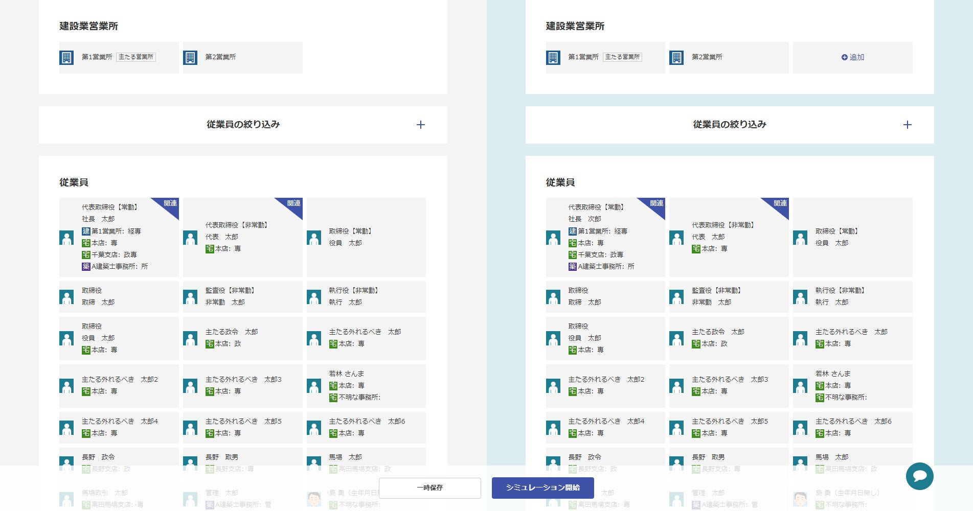 建設業や宅建業など複数の許認可を持つ企業が、事業所の移転や人員の配置替えで生じる許認可要件不足を回避するための、シミュレーション機能を搭載予定です。