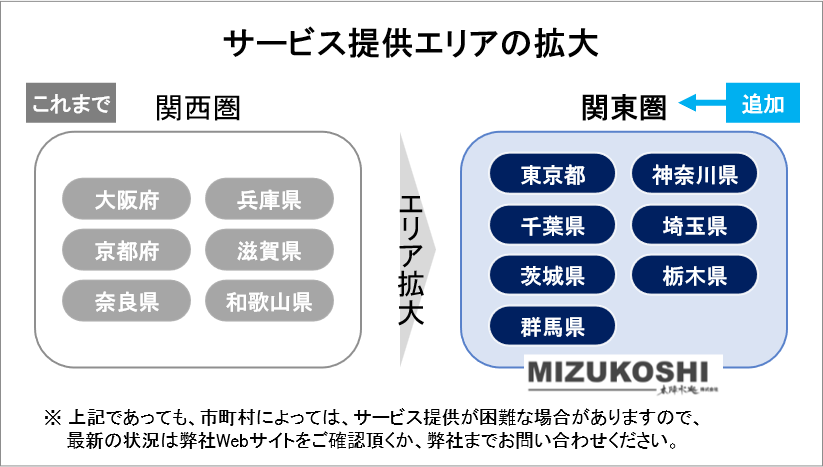 当社は創業以来、関西圏を中心にサービス提供を行ってきました。このたび、関東圏のネットワークを有する本陣水越株式会社と連携することで、サービス提供エリアの拡大が実現しました。