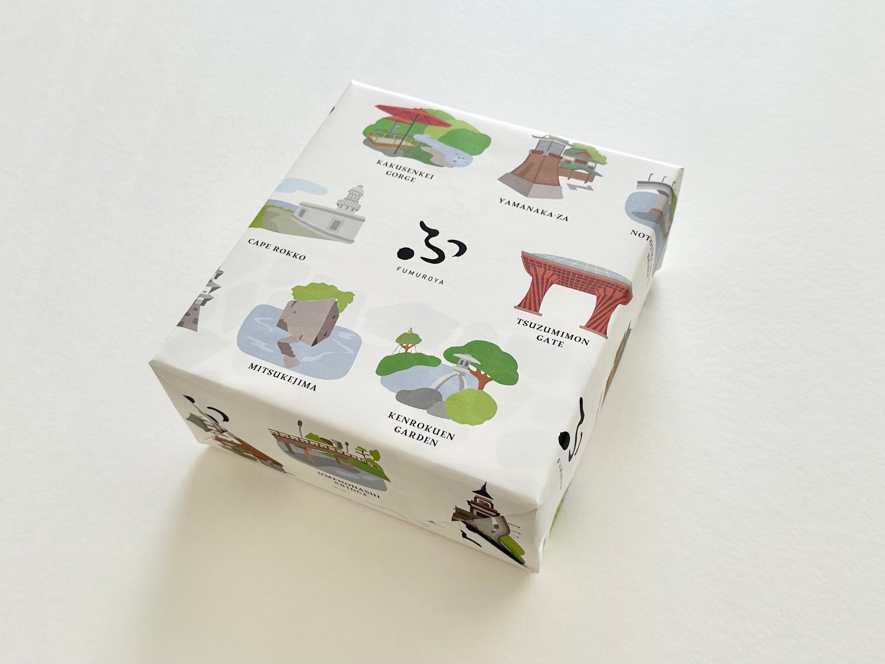 包装紙には能登・金沢・加賀の観光名所を配し、箱には石垣模様を施しています。いしかわの魅力をあらためて伝え、能登への想いを表現しました。昆布だしが上品に香るあっさりとした味わいのおすましに、能登の美しい花「のとキリシマツツジ※」を映した加賀麩が浮かびます。石川県の文化が育んだ加賀麩に、郷土への想いを込めたひと品となっています。