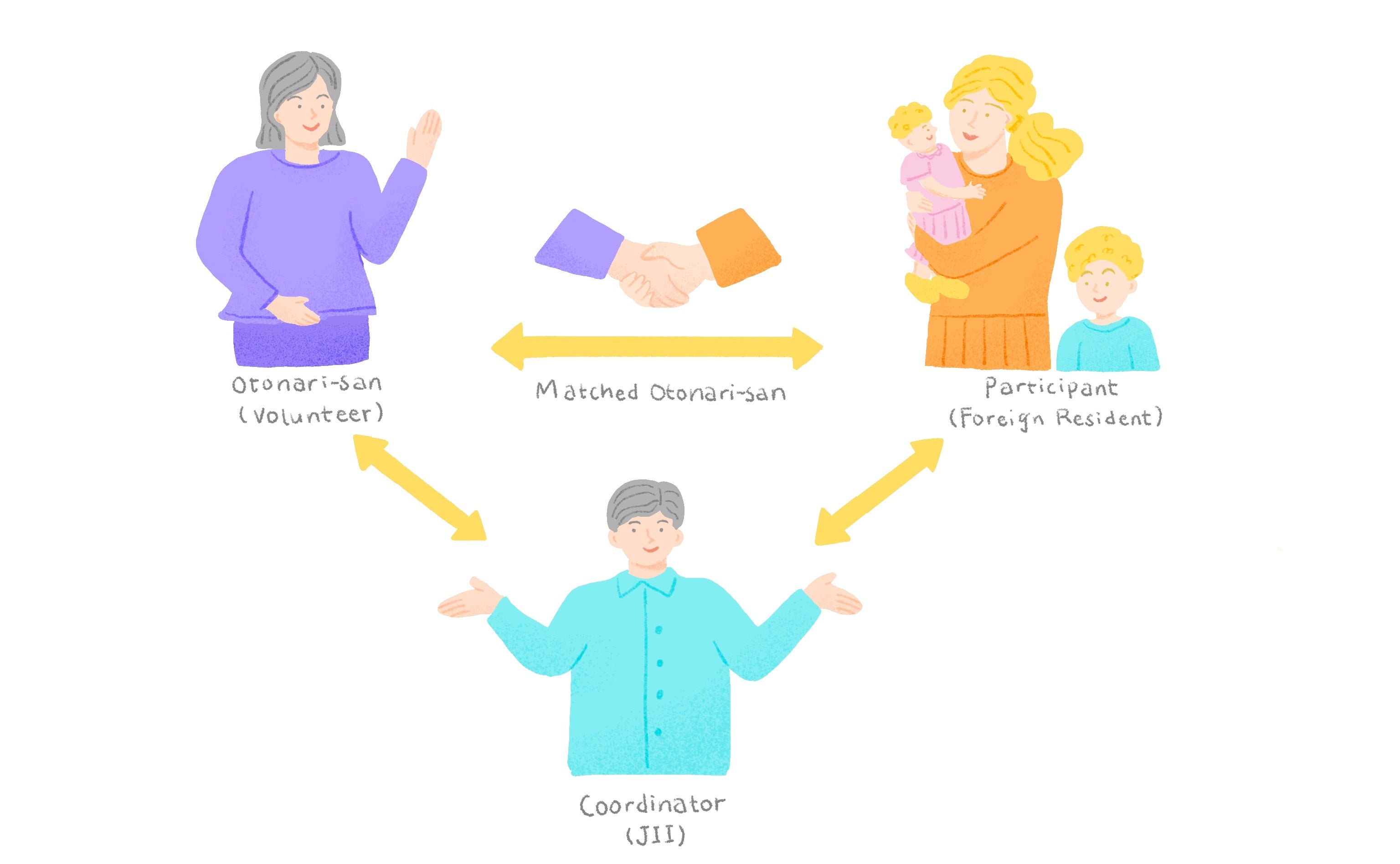 JIIは外国人住民が日本に馴染みやすくすることをミッションに掲げています。2020年に開始した「おとなりさん・ファミリーフレンド・プログラム(OFP)」は、日本人ボランティアと外国人住民が半年間ペアを組み、日常的にサポートや交流するプログラムです。食事やおしゃべり、買い物や子育ての相談など、ささやかな交流を通して“小さな理解”が生まれ、相互理解の芽が育っています。これまでに延べ1,500人以上が参加し、双方から高い満足の声が寄せられています。