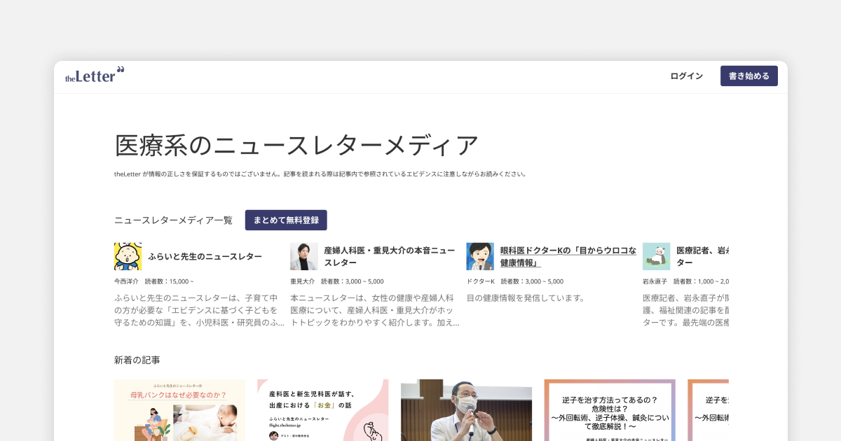 theLetter では医師などの医療従事者や医療系ジャーナリスト・ライターによるニュースレターメディア開設が増加しており、関連する読者ユーザーは数万人規模になっております。