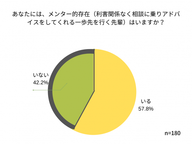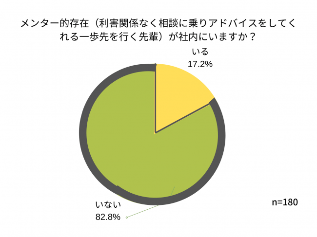一方で、今、社内に相談相手(メンター的存在)がいるかどうかの質問に「いない」(社内外どちらにもいない+社外にいる)と答えた女性は82.8%にのぼり、多くの女性がコロナ禍で働き方の変化と同時にキャリア観の変化も起きている中、相談相手の整備が急務となっている現実がわかりました。