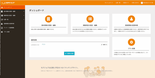 2019年11月に、登録企業が会社紹介のページなどの機能を扱う、モグジョブサイト内の管理画面を全面的に刷新いたしました。これにより、操作性やデザイン性などを向上させ、よりわかりやすく学生に自社の魅力を知ってもらうことができるようになりました。