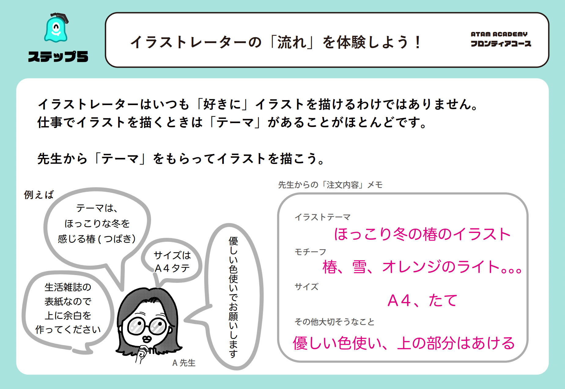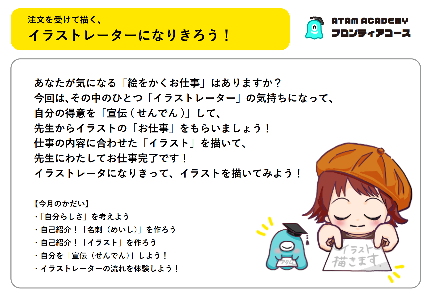 今回の授業では、実際のイラストレーターと同様に、発注者からの指示を守りながらも、子どもたちの個性が出るようなイラスト表現を模索していきます。発注者の指示内容と子どもたちの個性の中でバランスに気をつけながら、「自分らしさ」について考えていきます。授業の詳細はこちらをご参照ください(https://atam-academy.com/blog/class/26804/)。