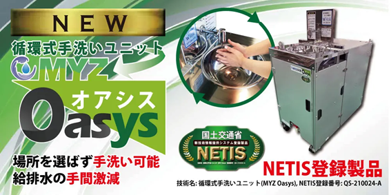 2021年9月、国土交通省:新技術情報システム『NETIS』に登録済の本商品は(登録番号: QS-210024-A、技術名称: 循環式手洗いユニット(MYZ Oasys®))、感染症対策を含む労働環境改善や現場環境改善費(旧・イメージアップ経費)等の活用実績が豊富にございます。