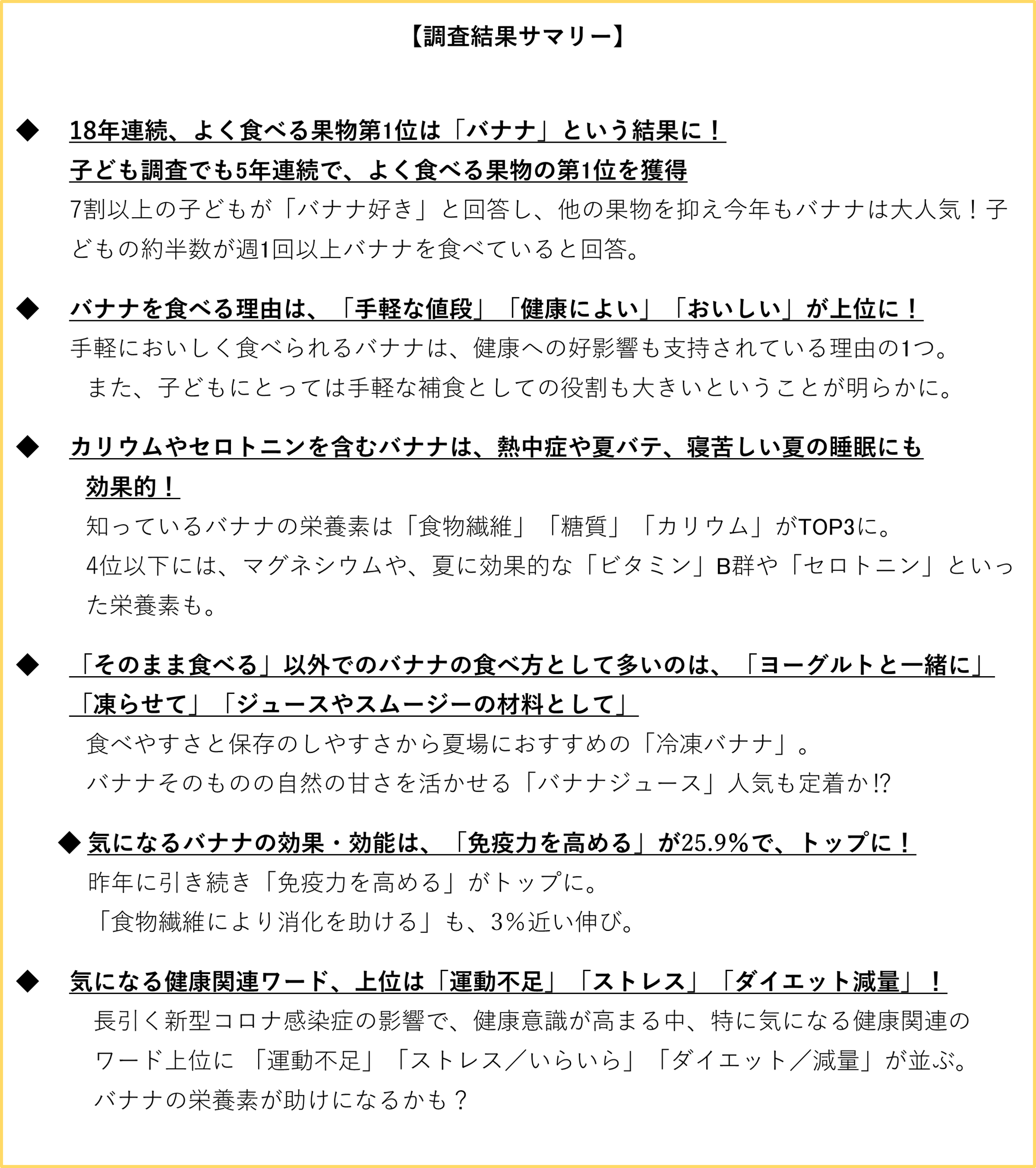 ~バナナは18年連続よく食べる果物No.1~ 熱中症対策や夏バテに最適なミネラルを含むバナナ!バナナの効果・効能では免疫力アップへの期待。新たな臨床試験結果への注目も!?