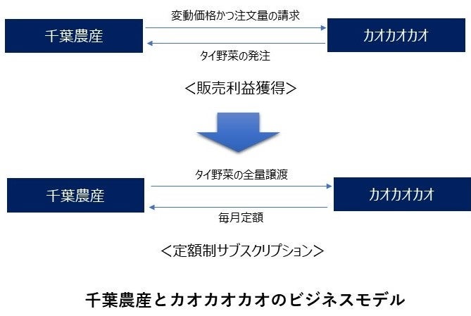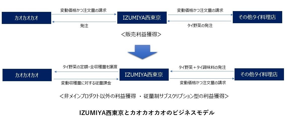 当社が千葉農産から全量買取したタイ野菜をIZUMIYA西東京に卸売りし、当社以外のタイ料理店にタイ野菜を販売することで両社が販売利益を獲得するのが通常のビジネスモデルです。しかし、この利益獲得の方法では当社とIZUMIYA西東京の両社が販売数量や販売価格によって利益変動し収入が不安定です。そこで、当社はIZUMIYA西東京へ事前に定められた販売価格で、当月収穫された全量のタイ野菜を購入する形式にしました。いわゆる収穫の変動量により従量課金料を頂く従量制サブスクリプション型の利益獲得の方法です。