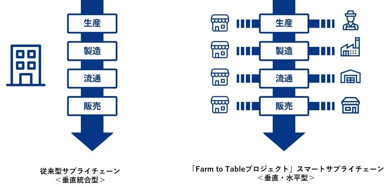 今回、当社が目指すスマートサプライチェーンは、生産・流通・製造・販売の各セクションにおいて他業界のパートナー企業と協業することで、お互いの課題を解決できる新たなビジネスモデルを構築した「垂直・水平型」のサプライチェーンモデルであることが大きな特徴です。「垂直・水平型」であれば、中小の外食企業でも他社と協業することで各パートナーの強みを活かしたスマートサプライチェーンの構築が可能となります。さらに、デジタルの仕組みを活用(DX化)することで、より効果的かつ効率的なサプライチェーンを実現できます。