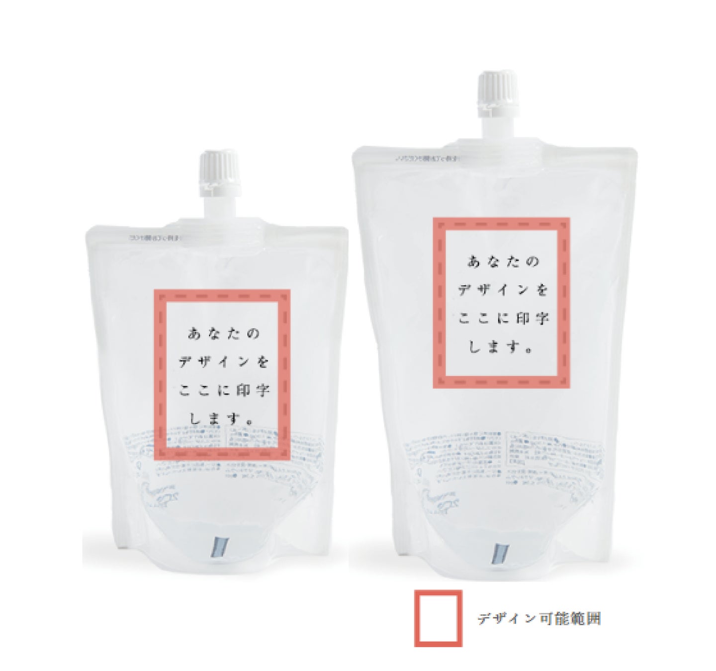 熊本県南阿蘇村の100%天然水を使用したパウチウォーターの表面に、「ロゴ」「メッセージ」「QRコード」など、お好きなデザインを印字することができるサービスです。