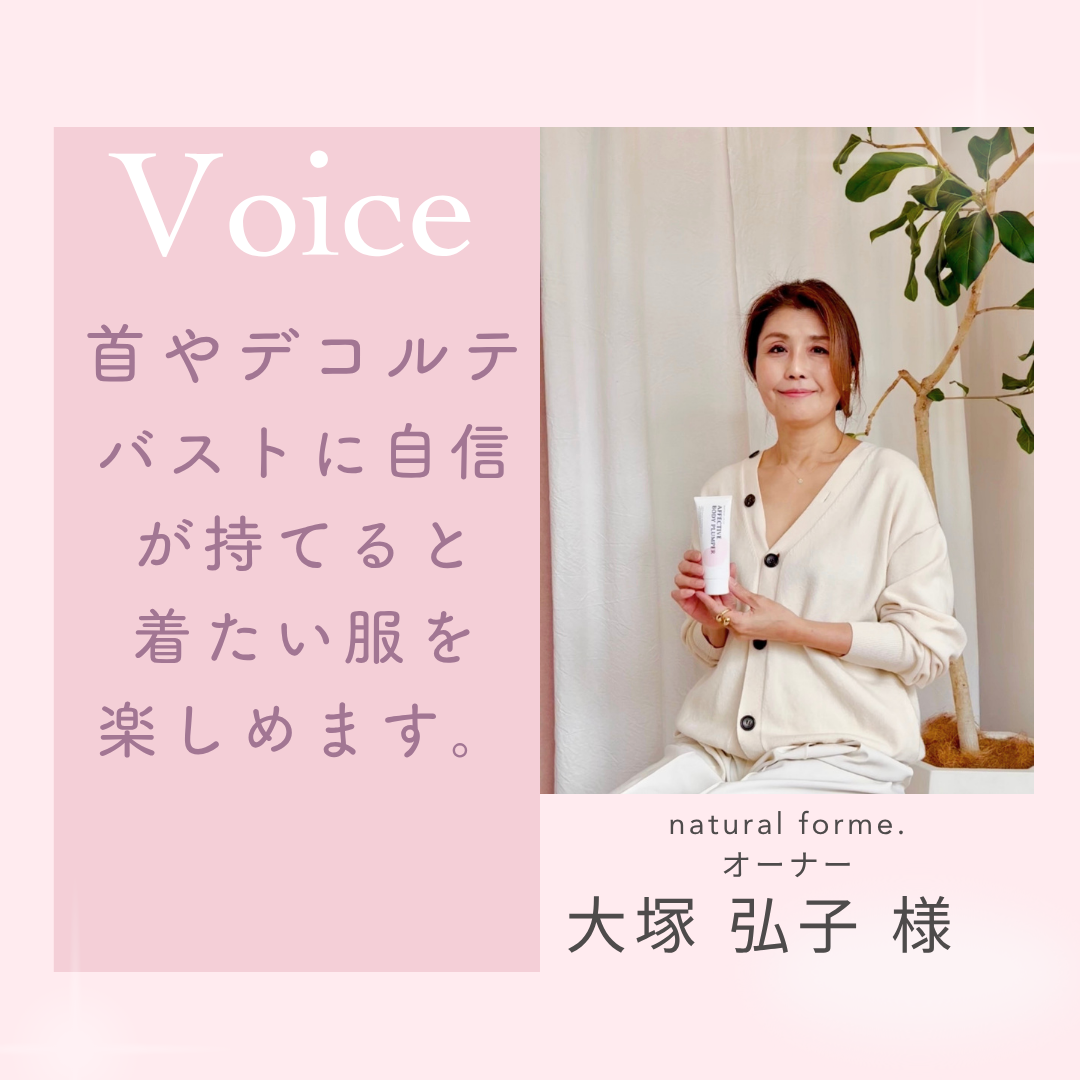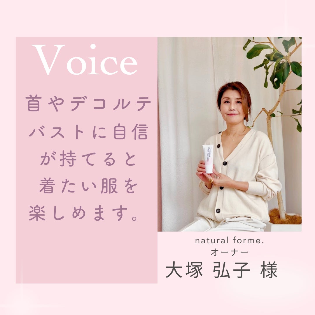 年齢とともに首元のシワやデコルテの削げが目立ち、以前は“寂しげに見えるのが嫌”だったが、ケアを始めてから“着たい服を着よう”と前向きになれた」 natural forme.オーナー 大塚 弘子様