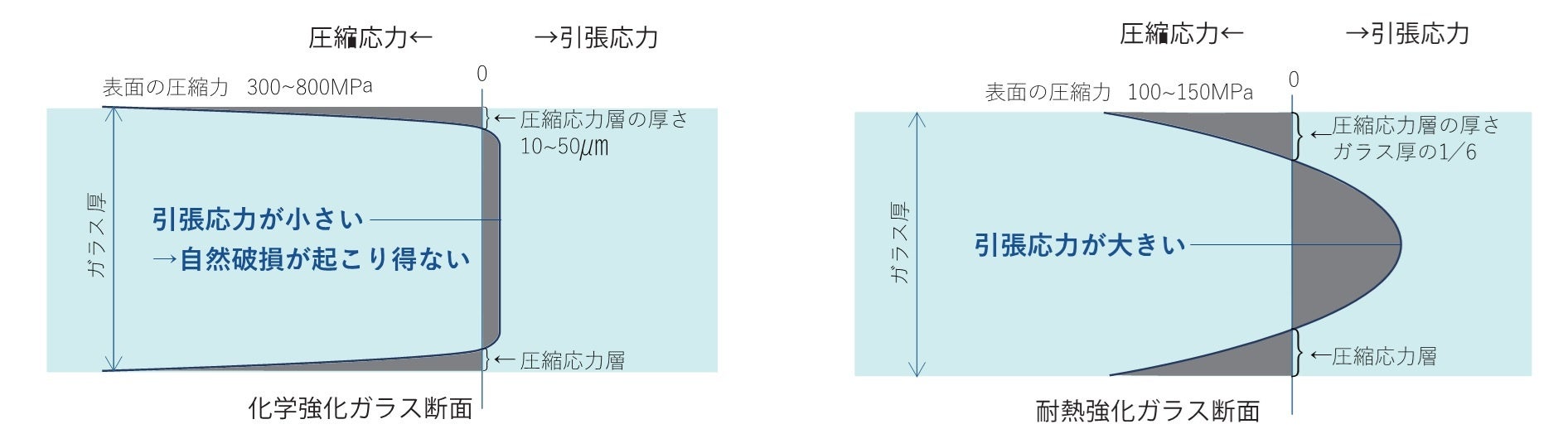 従来の耐熱強化ガラスは、加熱後の急冷による製造工程で歪みや微細な凹凸が発生するため、透明性や平滑性に課題がありました。しかし、化学強化ガラスはガラスを軟化させない低温処理を採用しているため、フロートガラスと同等の平滑度と光学特性を持ちます。