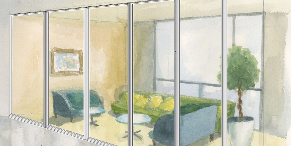 旭ビルウォールでは、これらの防火設備に加え、1時間耐火間仕切壁「バーニングシールド」をラインナップし、『防火ガラスシリーズ』として展開してまいります。美しい透明度と平滑度を備えたこのシリーズは、防火性能が求められる空間において、新たな建築設計の可能性を切り開きます。