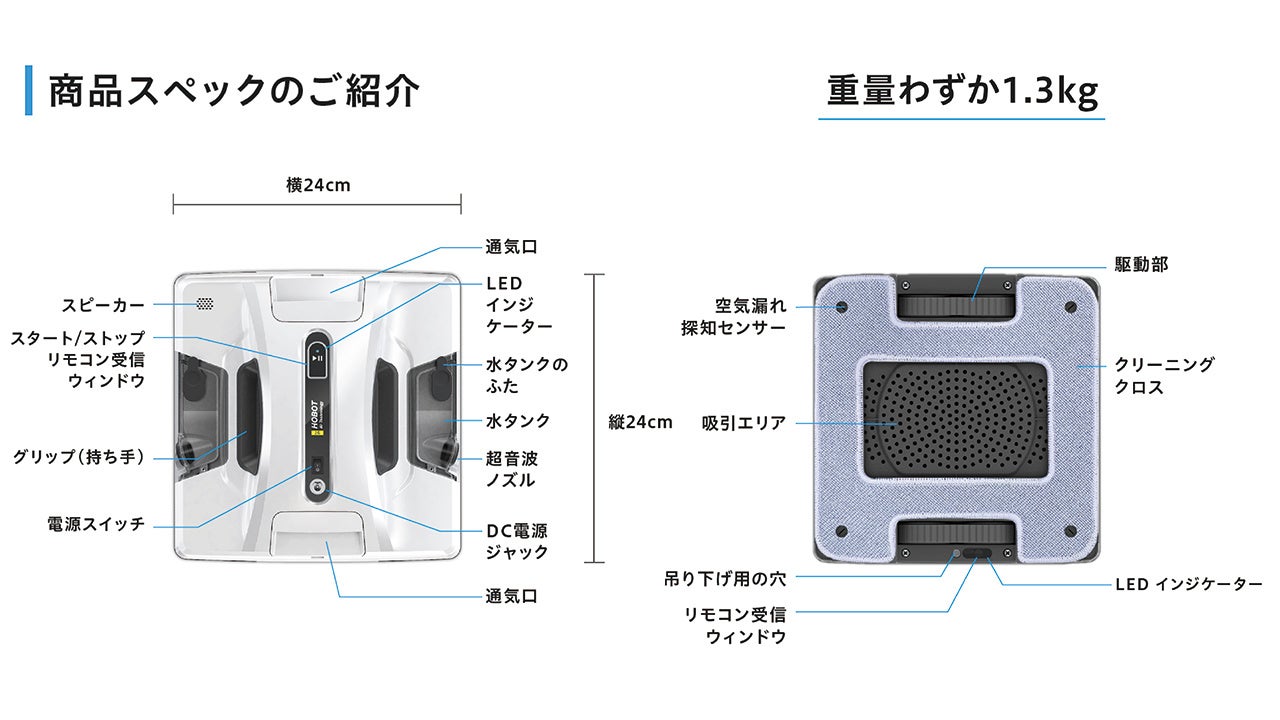 本体を窓に貼り付けたら、再⽣ボタンをワンタッチするだけで⾃動清掃がスタート。