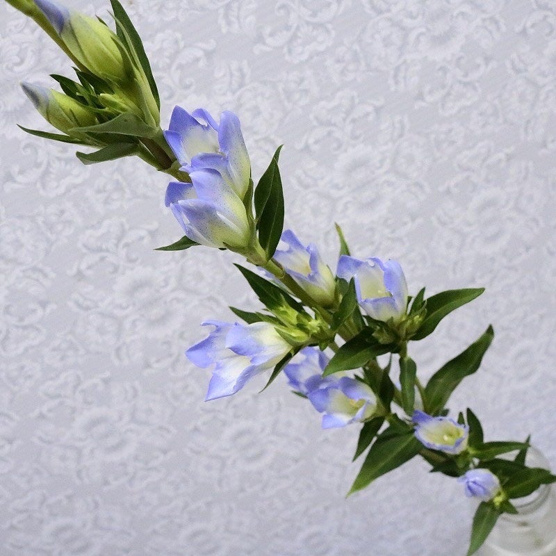 岩手県は国内随一のリンドウ生産地。なかでも、JA新いわて八幡平花卉生産部会様は大田花きにおける流通シェアの半分以上を誇ります。安代のはごろもは、八幡平市のオリジナル品種。透き通るような水色で涼やかさを演出。天女が羽衣をまとったかのような印象で、仏花のポジションだったリンドウの需要をホームユースにも広げ、幅広く支持されました。