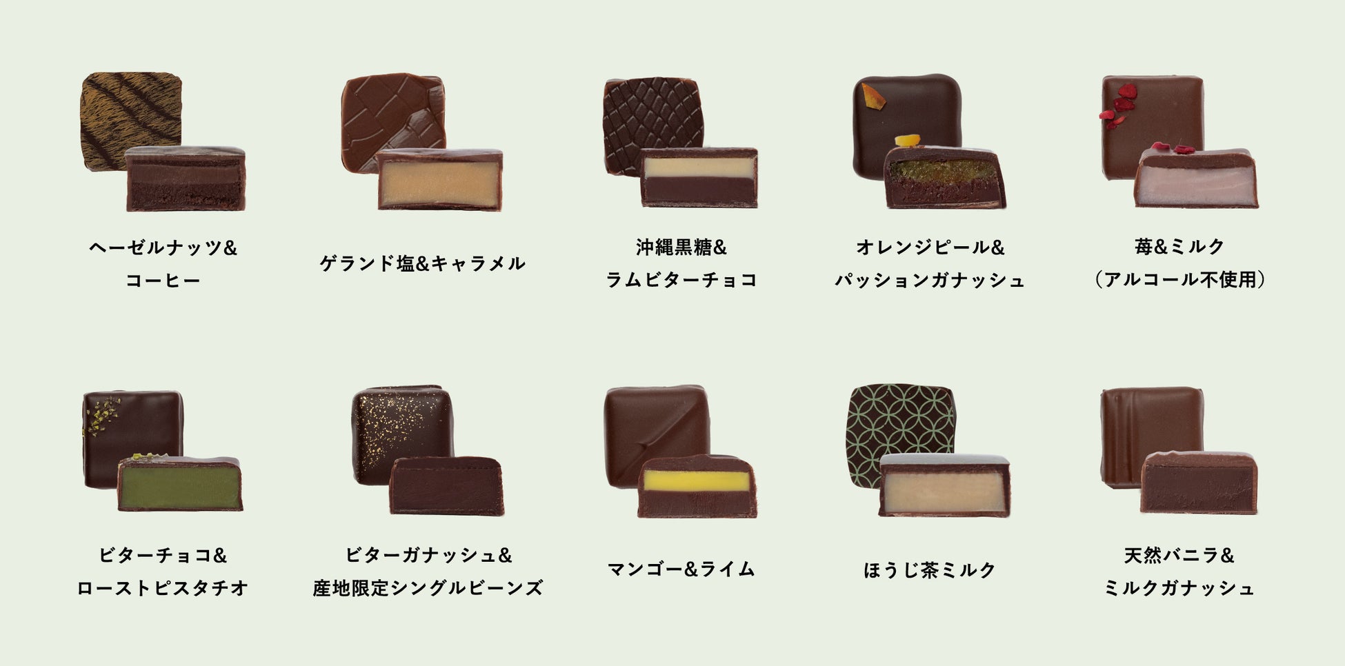 ヘーゼルナッツ&コーヒー、ゲランド塩&キャラメル、沖縄黒糖&ラム酒ビターチョコ、オレンジピール&パッションガナッシュ、苺&ミルク(アルコール不使用)、ビターチョコ&ローストピスタチオ、ビターガナッシュ&産地限定シングルビーンズマンゴー&ライム、ほうじ茶ミルク、天然バニラ&ミルクガナッシュ 各1個