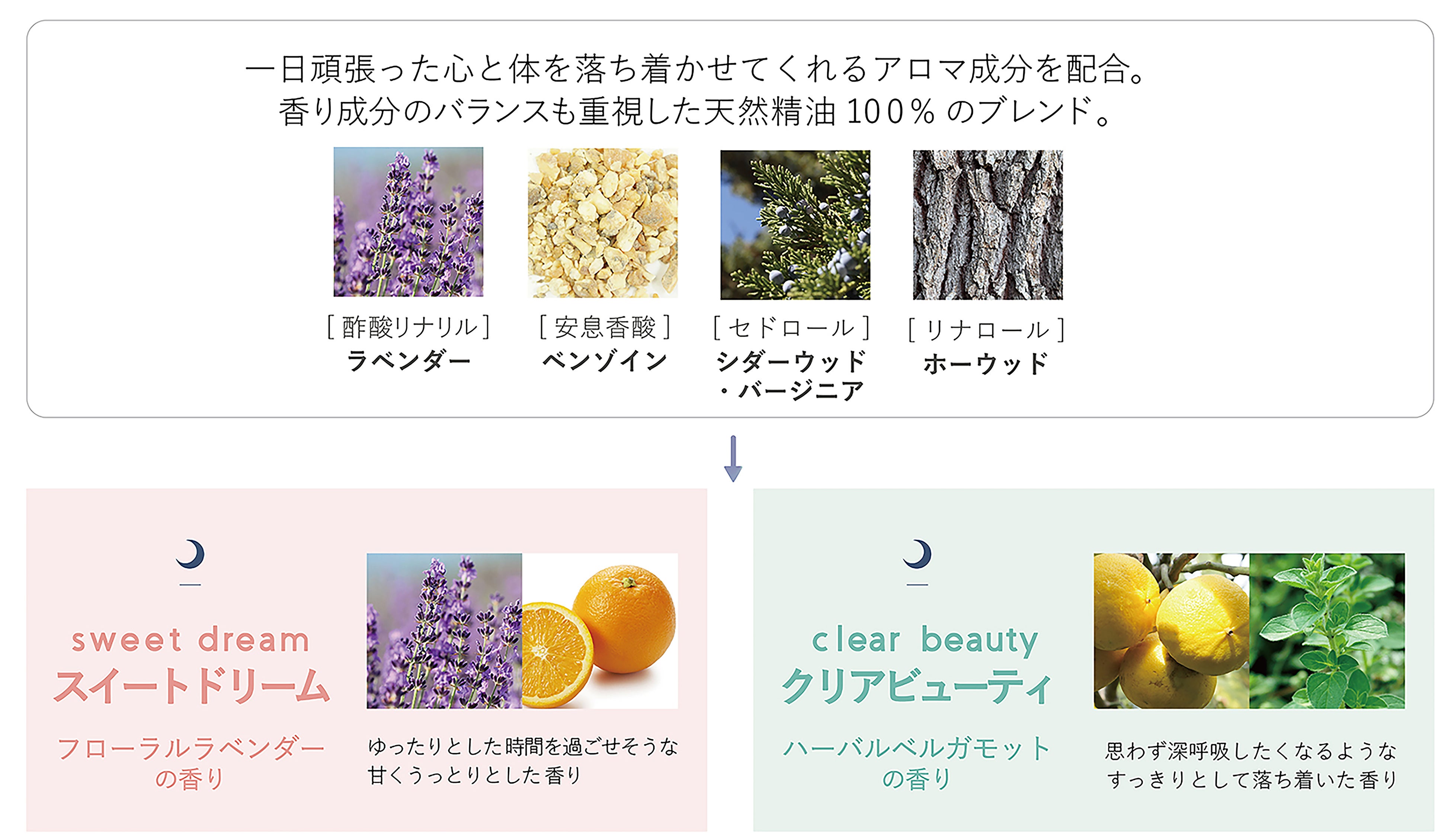 ◎スイートドリーム:ラベンダーとオレンジをベースとした甘くうっとりとした香り◎クリアビューティ:ベルガモットとユーカリをベースとしたすっきり落ち着いた香り