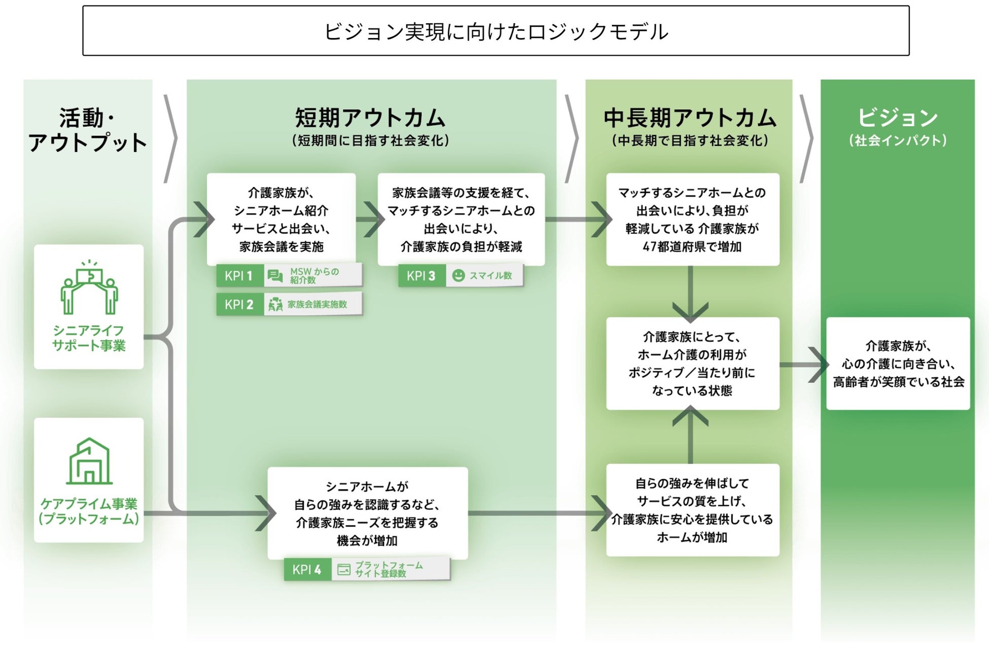 当社は、2023年4月13日開催の取締役会にて「ビジョン(社会インパクト)」を実現するための基本方針を決議しました。介護家族が高齢者に対する「心の介護」に専念できるよう、「介護家族にとって、ホーム介護の利用が『ポジティブ/当たり前』になっている状態」を目標に掲げています。これにより「家族が心の介護に向き合い、高齢者が笑顔で居る社会」の創出に向けた取り組みを進めています。