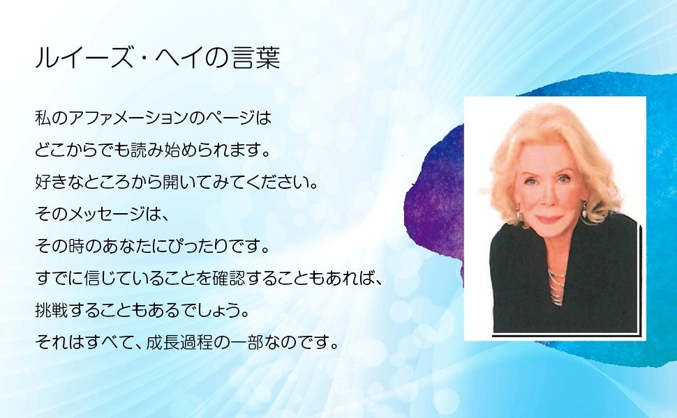 ルイーズ・ヘイ(1926.10.8~2017.8.30)は、1976年自身の経験と自己啓発メソッドをまとめた処女作「Heal Your body」を自費出版し、これが大きな反響を呼ぶ。その後も世界中で5000万部以上発行されているベストセラー「You Can Heal Your Life」、「The Power is Within You」など数々のベストセラーを世に送り出し、世界的な自己啓発の権威として、講演活動を通して多くの人々に影響を与えた。出版社Hay Houseの創立者でもある。現代の自己啓発運動の立役者の一人として知られている。ポジティブな変化をもたらすアファメーションの力を実証したことで有名。書籍のほかにも、健康で楽しく充実した人生を送るためのオーディオCDやビデオプログラム、カードデッキ、オンラインコースなどを数多く手がけた。1980年代後半、エイズが蔓延し始めると、偏見や差別と闘いながらエイズ患者へのサポート活動にも積極的に取り組んだ。