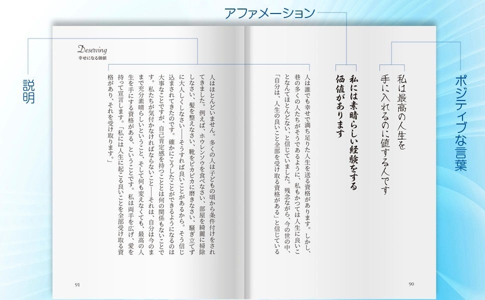 本書は、彼女の真価を知る脳科学者、駒野宏人氏が、脳に起こる科学的な効果をわかりやすく解説すると共に、掲載されている彼女のメッセージ集を用いた「アファメーション」の実践方法をやさしく教えてくれます。