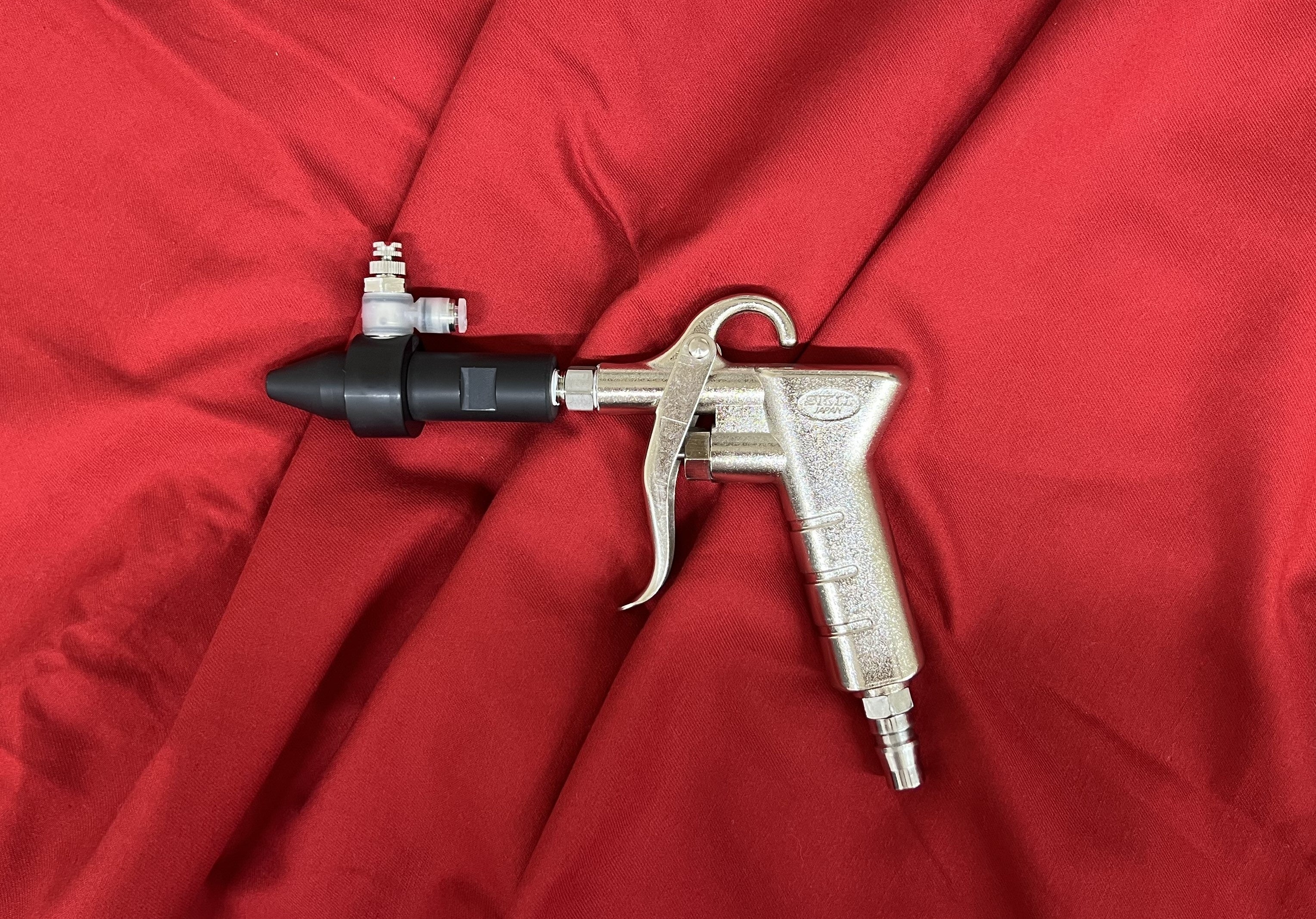 水だけを使って半導体から野菜までをノンダメージで洗浄できる高速ミストを噴出するノズルです。一般的な高圧洗浄機の約1/6000の水量で油汚れさえ落とすことが可能であり、特許を取得しています。