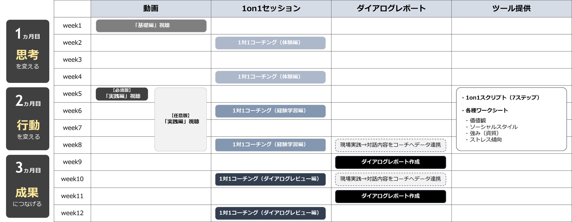 当社が考えるビジネスコーチングの3ステップ(思考を変える➡行動を変える➡成果につなげる)をベースに、当社オリジナル動画コンテンツや1対1コーチングを組み合わせて実施することで、クライアント1人ひとりの効果的な対話力向上を支援します。