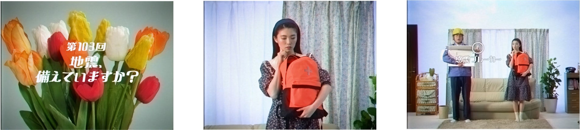 「関西電気保安会話講座」第103回のテーマは地震への備えについて。防災バッグの中身をチェックするゆきこと、感震ブレーカーを紹介する関西電気保安協会職員に、監督が放った言葉とは?
