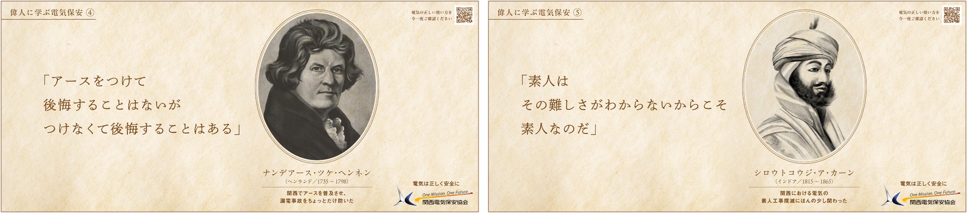 電気保安にまつわる架空の偉人の架空の名言を連日ご紹介。電気保安の重要なポイントを、偉人の名言や名前を通してユーモラスにお伝えします。偉人「ナンデアース・ツケ・ヘンネン」(=何でアース つけへんねん)や「シロウトコウジ・ア・カーン」(=素人工事アカン)など、ユーモアあふれるその名前と名言を、肖像イラストとあわせてお楽しみください。