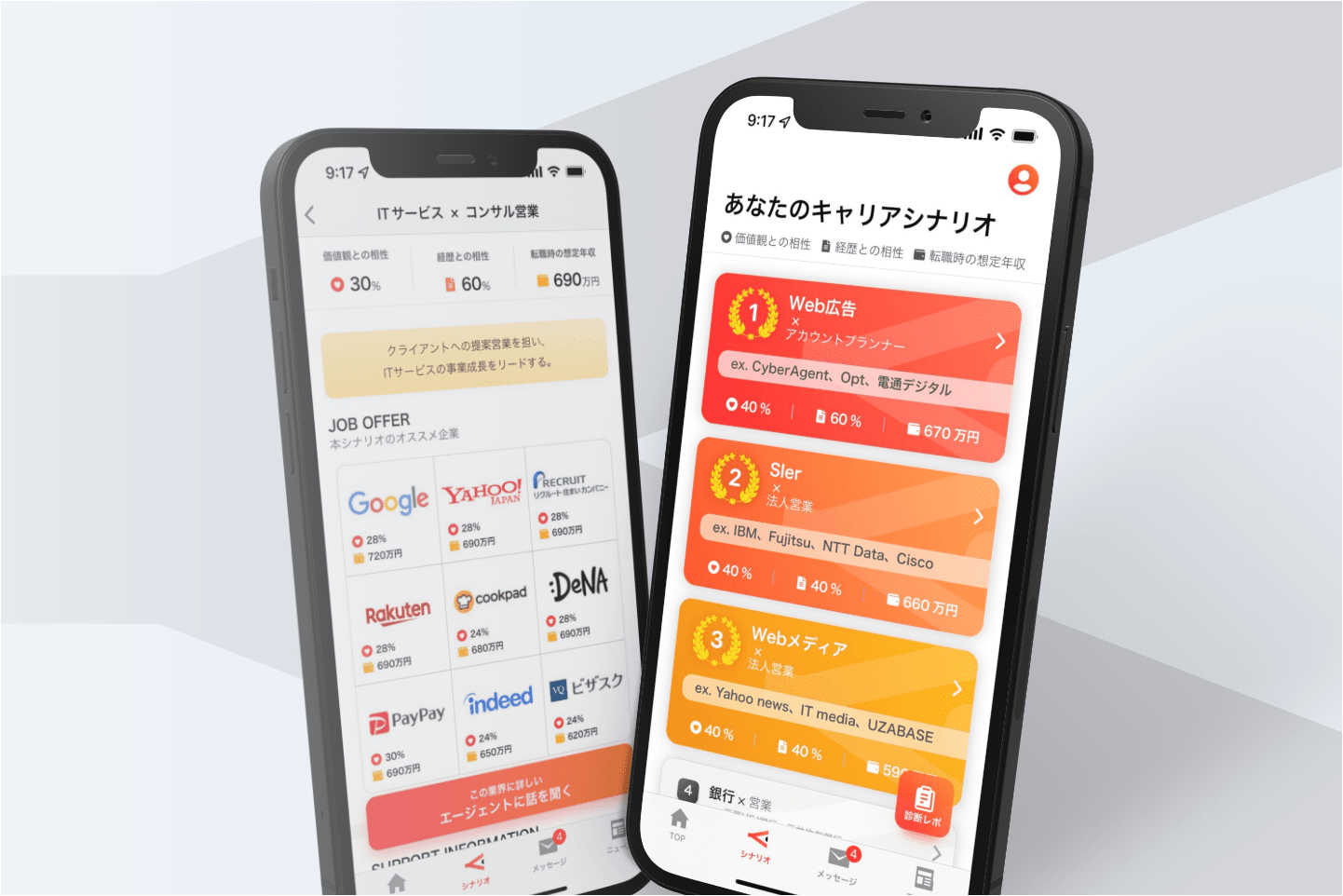 既存サービスは市場価値やスキルマッチを軸とする一方、『VIEW』は価値観を軸とした独自のロジックで分析した「キャリアシナリオ」を提示します。キャリアシナリオは業界×職種の1,000以上の組み合わせから、一人ひとりに最適なシナリオをランキング形式で表示します。そのため、今の仕事と親和性が高い仕事ではなく、あなたの経験と価値観が活きる最適なキャリアの選択肢が分かります。