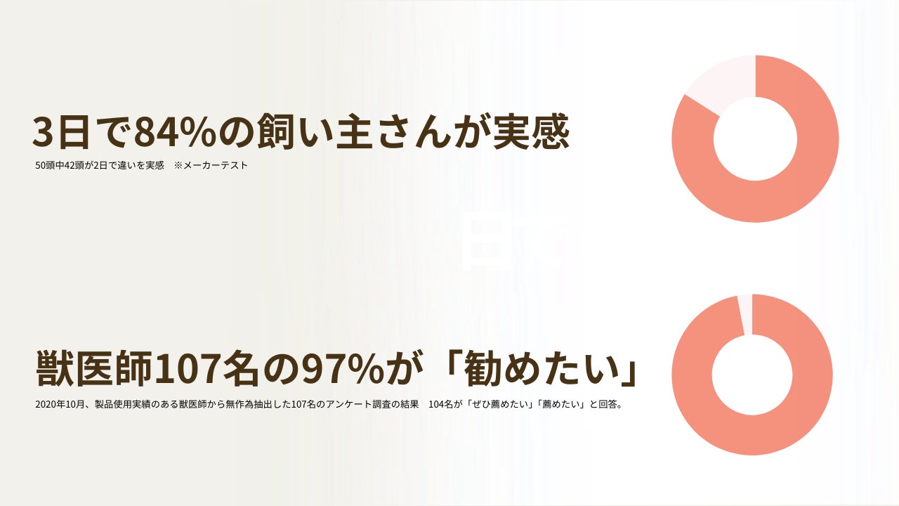 ※2:2020年10月、製品使用実績のある獣医師から無作為抽出した107名のアンケート調査の結果、104名が「ぜひ薦めたい」「薦めたい」と回答、メーカー調査