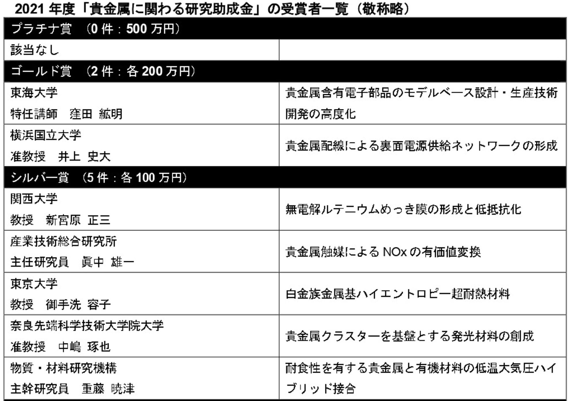 一般財団法人 田中貴金属記念財団(代表理事:岡本英彌)は本日、2021年度「貴金属に関わる研究助成金」の受賞者を発表しました。