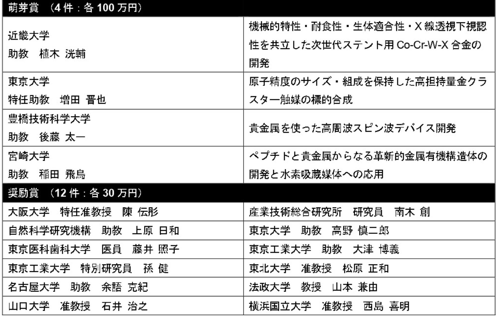 田中貴金属記念財団 「貴金属に関わる研究助成金」の受賞者を発表