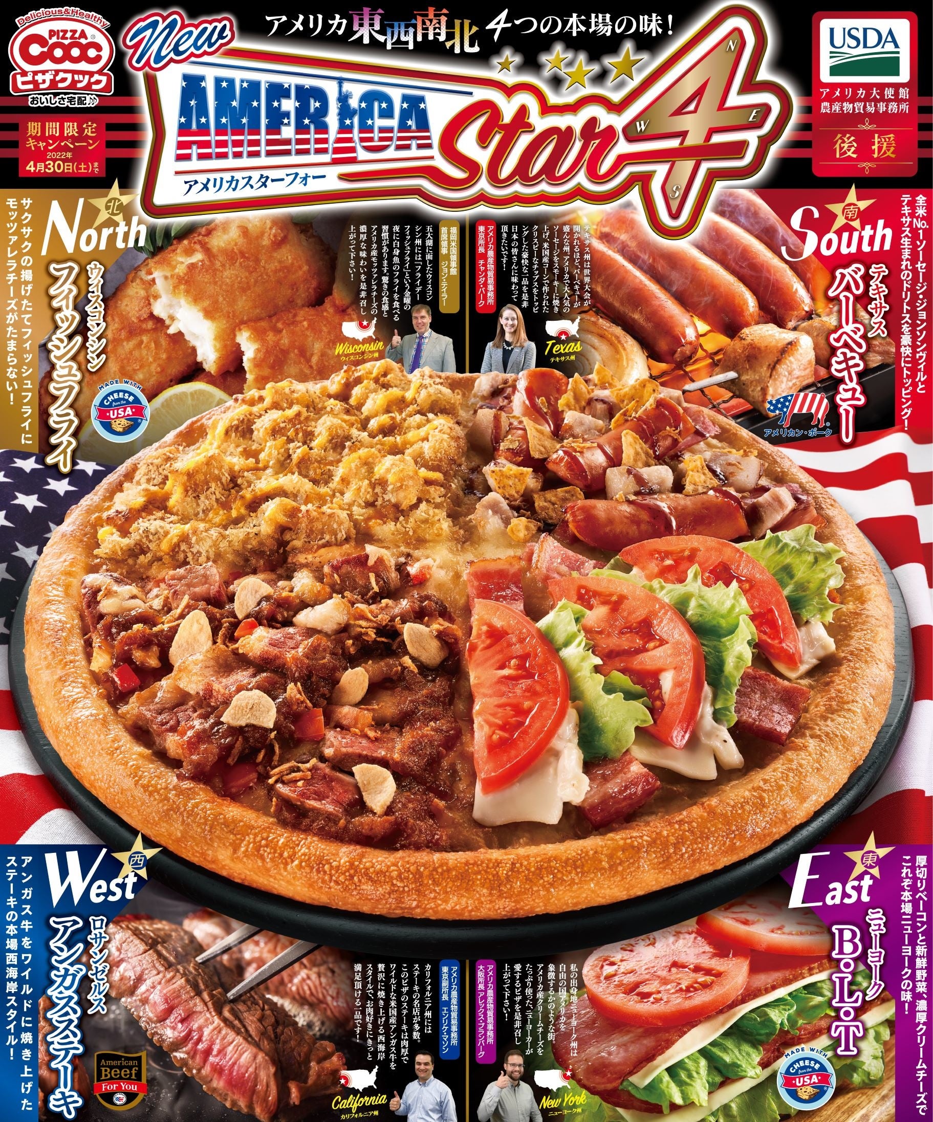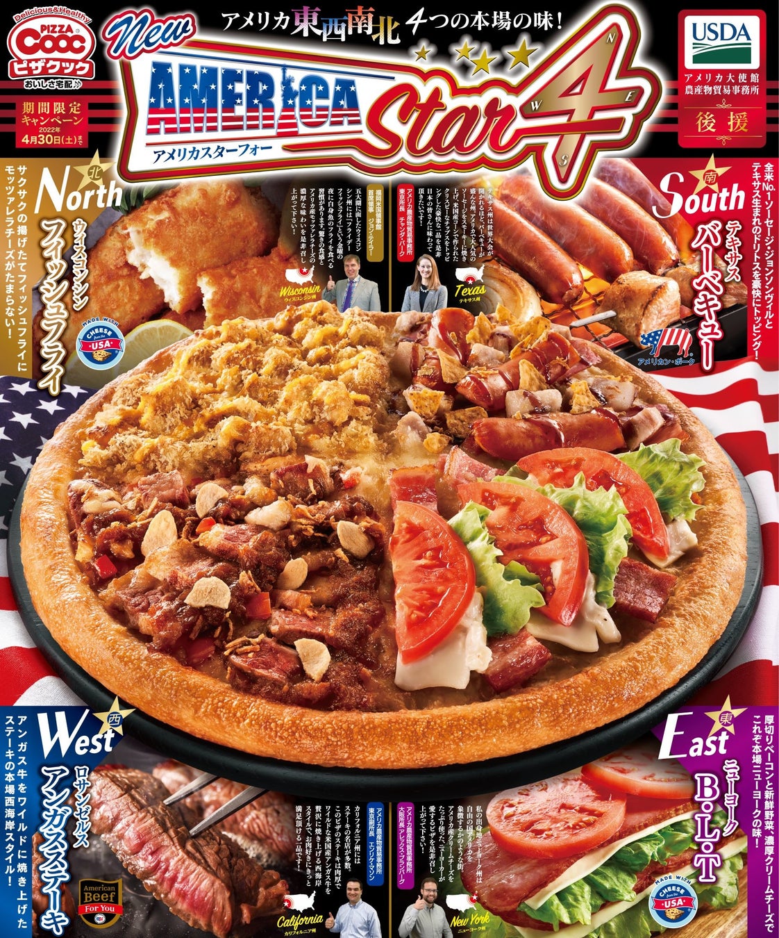 ピザクック(運営元:イワタダイナース 福岡市博多区諸岡3-25-20)から1/19(水)に「アメリカスターフォー」新登場!サクサクの揚げたてフィッシュフライにアメリカ産モッツァレラチーズを使用した「ウィスコンシンフィッシュフライ」、カリッと焼き上げた全米No1ソーセージブランド・ジョンソンヴィルと、その上にトッピングされたテキサス生まれのドリトスの食感がたまらない「テキサスバーベキュー」、カリカリの厚切りベーコンに新鮮なレタスとトマト、そしてアメリカ産濃厚クリームチーズを使用した「ニューヨークB・L・T」、アンガス牛をワイルドに焼き上げた本場西海岸スタイルの「ロサンゼルスアンガスステーキ」、これら4つの味が1枚のピザで味わえる「アメリカスターフォー」を発売致します。是非ご賞味ください!後援頂いておりますアメリカ大使館農産物貿易事務所所長の皆様や、福岡米国領事館首席領事から推薦のお言葉もいただいております。