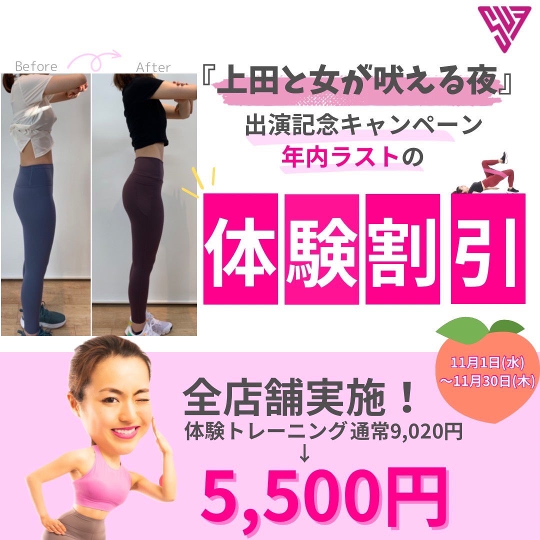 11月1日(水)〜11月30日(木)までの間、全店舗にて、一人一人の骨格、筋肉と脂肪のつき方を見てオーダーメイドパーソナルを行う「体験トレーニング」が、通常9,020円のところ5,500円で受けていただけます。