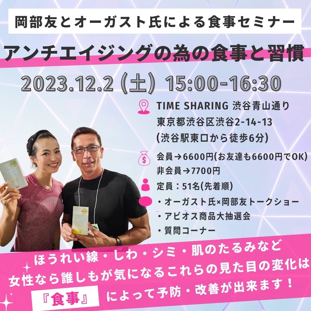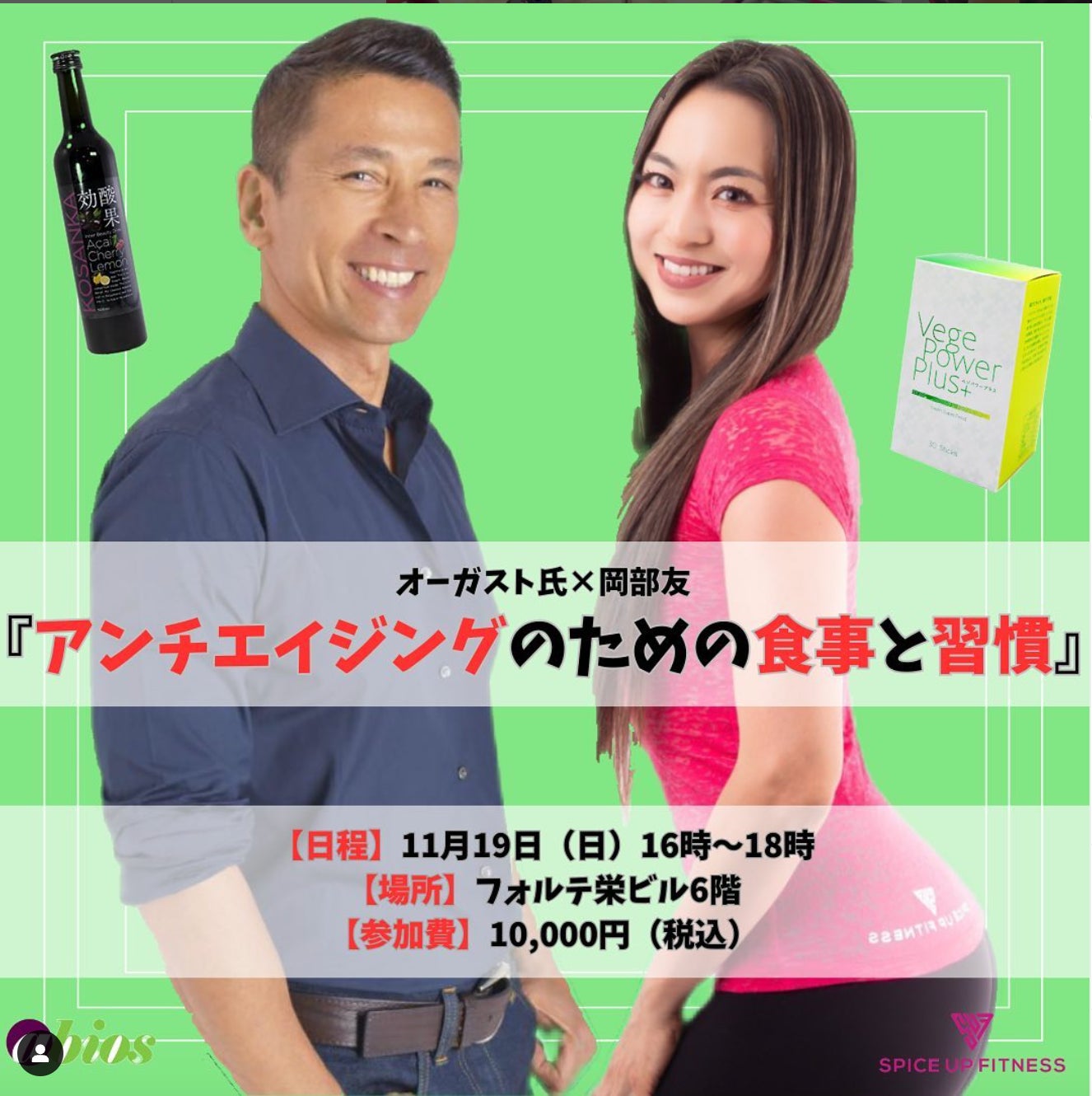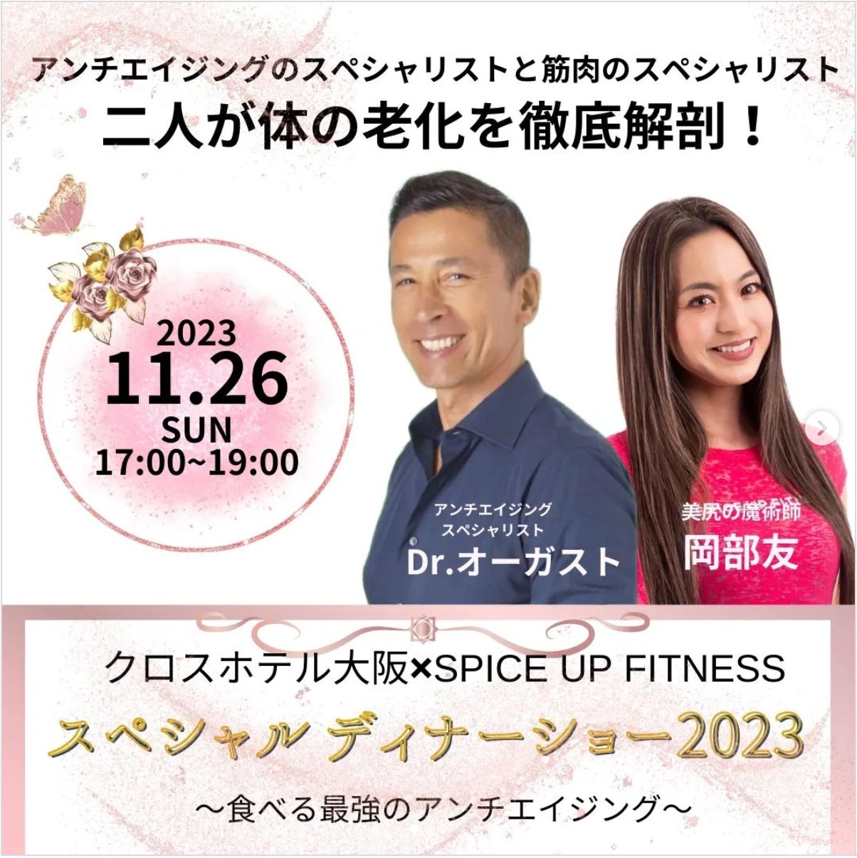 岡部友が代表を務め南青山・原宿・名古屋・心斎橋・梅田全国5店舗で展開する「SPICE UP FITNESS」では、栄養科学博士でもあり、アンチエイジング界のカリスマであるオーガスト・ハーゲスハイマー氏を迎え、特別なトークイベントを11月に名古屋と大阪、12月に東京にて開催します。