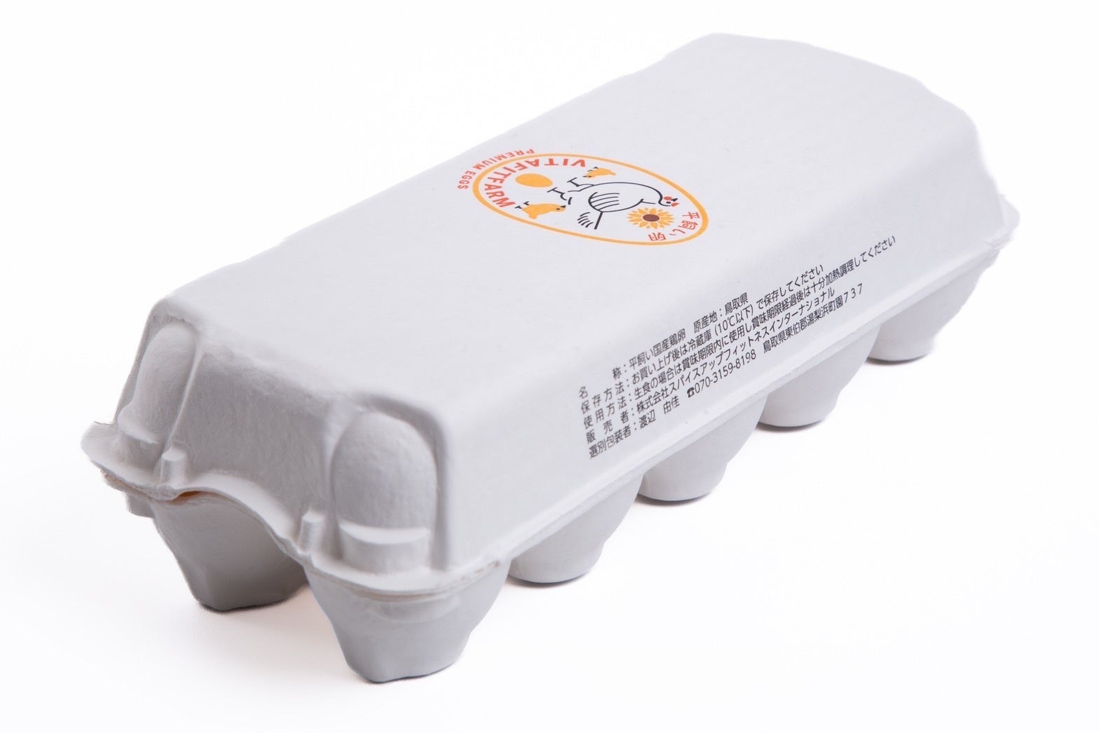「VITA FIT FARM」の特徴は、皆様に安心して卵をお楽しみいただくべく、いつどこで誰により、どのような餌の原材料を使用していることから生産をされているのかまで、100%追跡可能な状態になっています。養鶏場の親鶏たちは、鳥取県湯梨浜の旬なタケノコやスイカやカボチャといった季節ごとの地元野菜や発酵食品、海藻、蟹などを取り入れ、米を主食としています。このバランスの取れた食事から、のびのびと育まれた親鶏から生まれる卵は、栄養価が豊かで、季節ごとの風味をお楽しみいただけます。