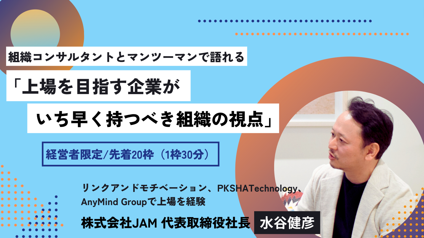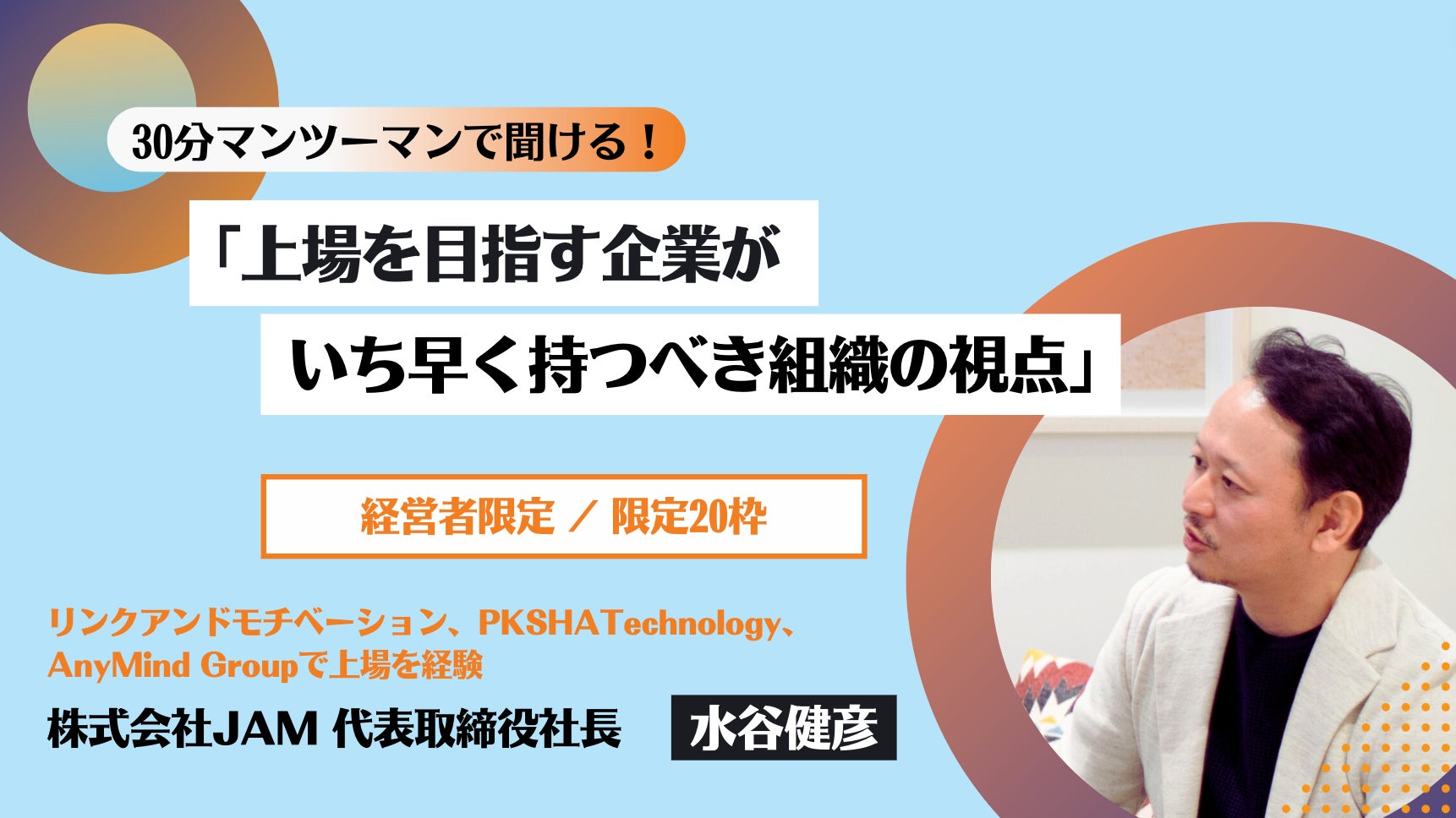「上場を目指す企業がいち早く持つべき組織の視点」をテーマに、外せないポイントや実体験に基づくノウハウのシェアを水谷から1対1でさせていただきます。※事前のやりとりや準備は特に必要ありません