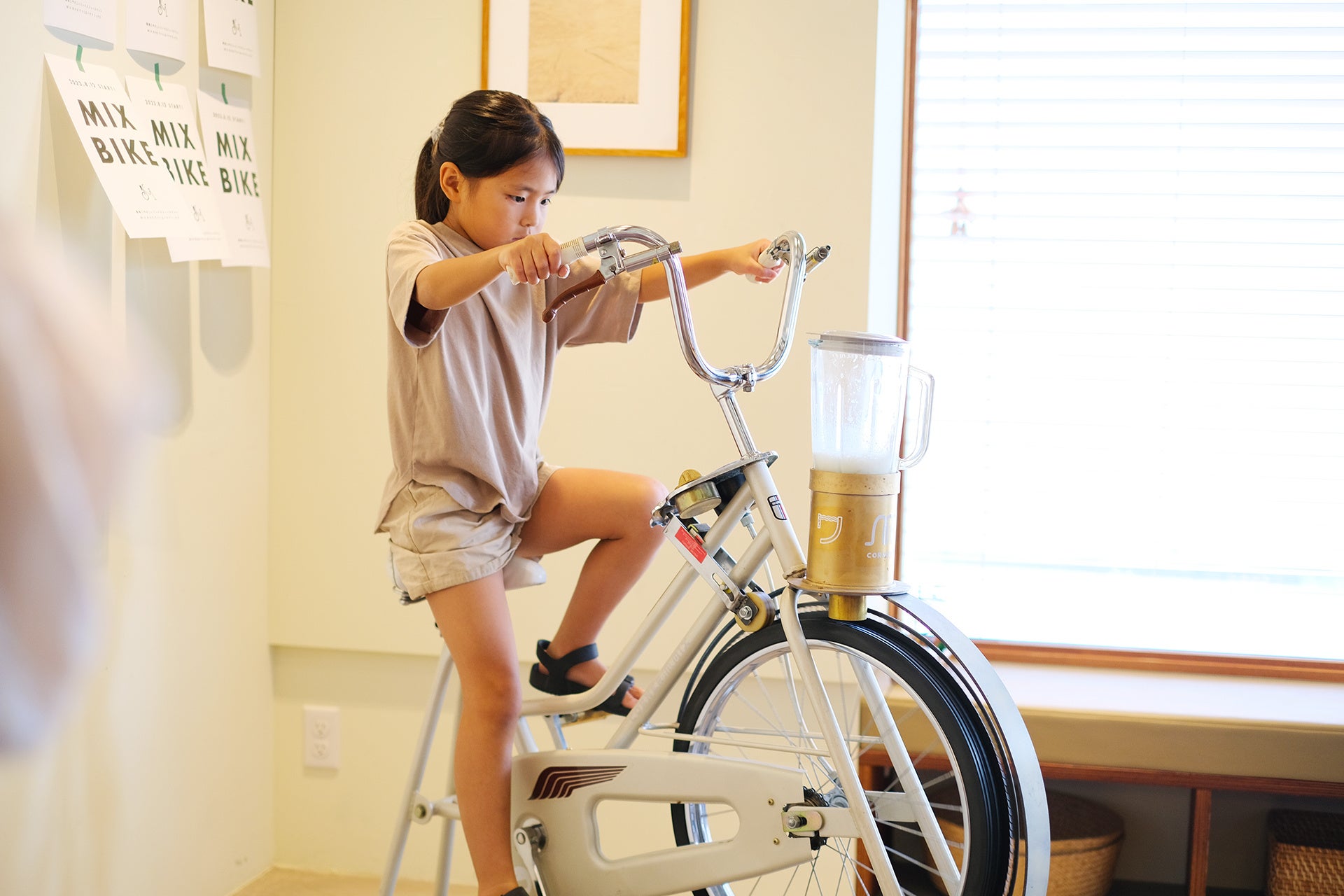 このワークショップでは、こどもたちが自分だけのオリジナルのミックスジュースをつくり、環境にやさしいMIX BIKEの魅力を体験できます。こどもたちが、好きな味、苦手な味にいつもより向き合えるような仕掛けをご用意しています。