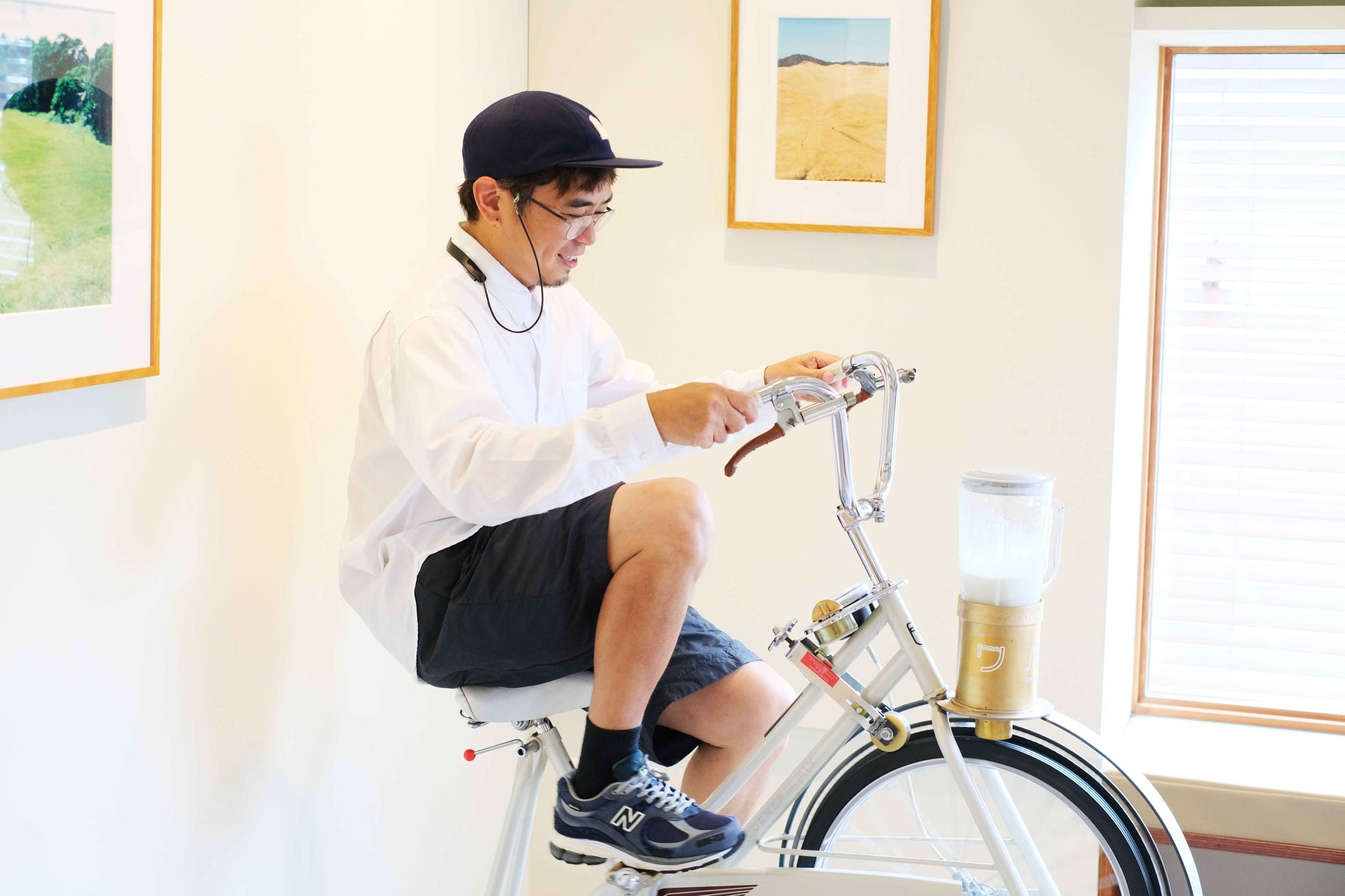「MIX BIKE」は電力を一切使用せず、ペダルを漕ぐ運動の力だけでミックスジュースをつくることができるマシンです。