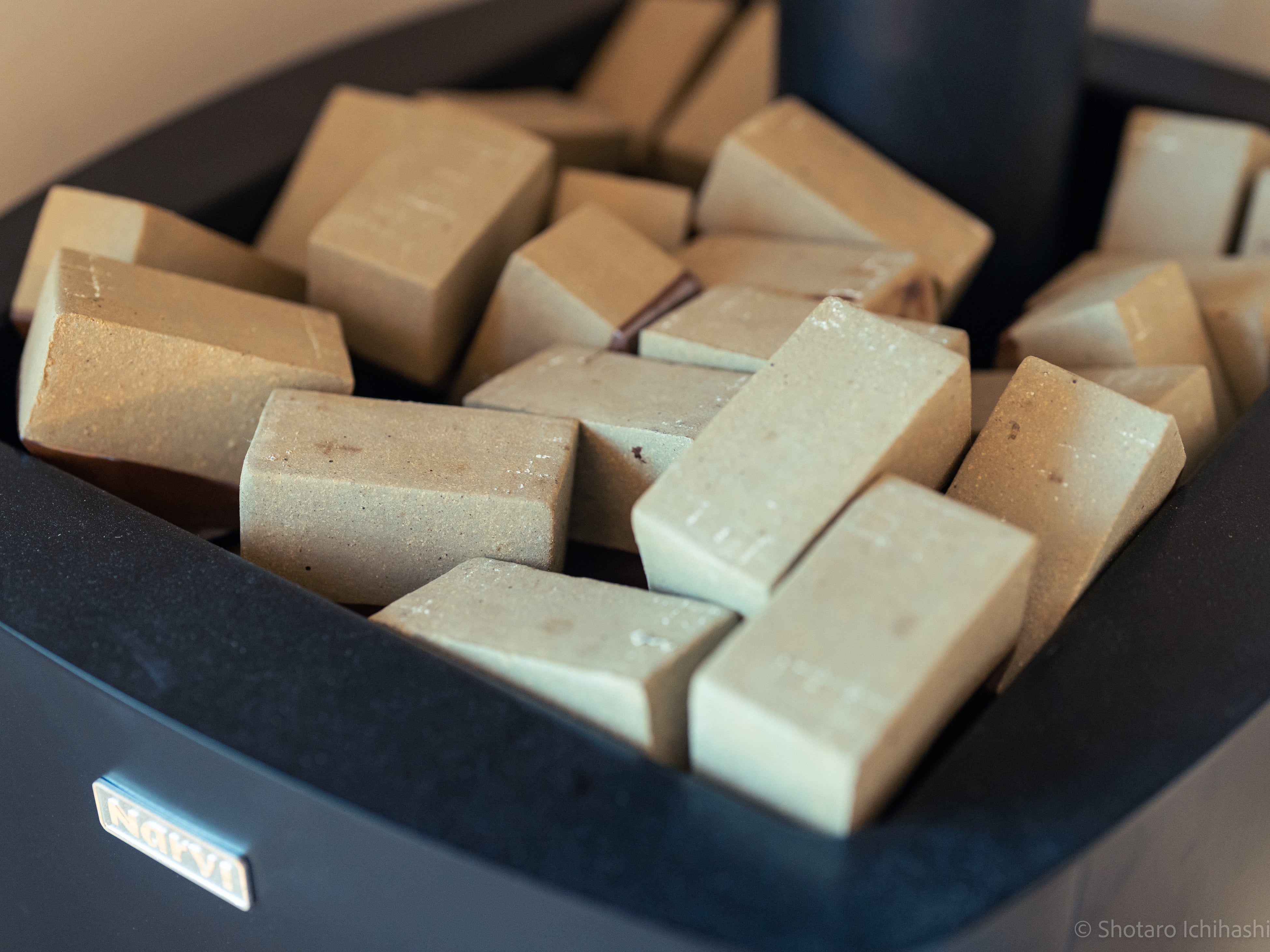 その取り組みの一環として、初期段階より島根県大田市温泉津町の「石州瓦」の技術を活かしたサウナストーンを搭載しております。来待石(きまちいし)だけの釉薬と焼成温度1350度で、職人の手によって丁寧に焼き上げられた石州瓦は、耐火・耐水・耐久性に優れた世界一丈夫とも言われる陶器瓦です。