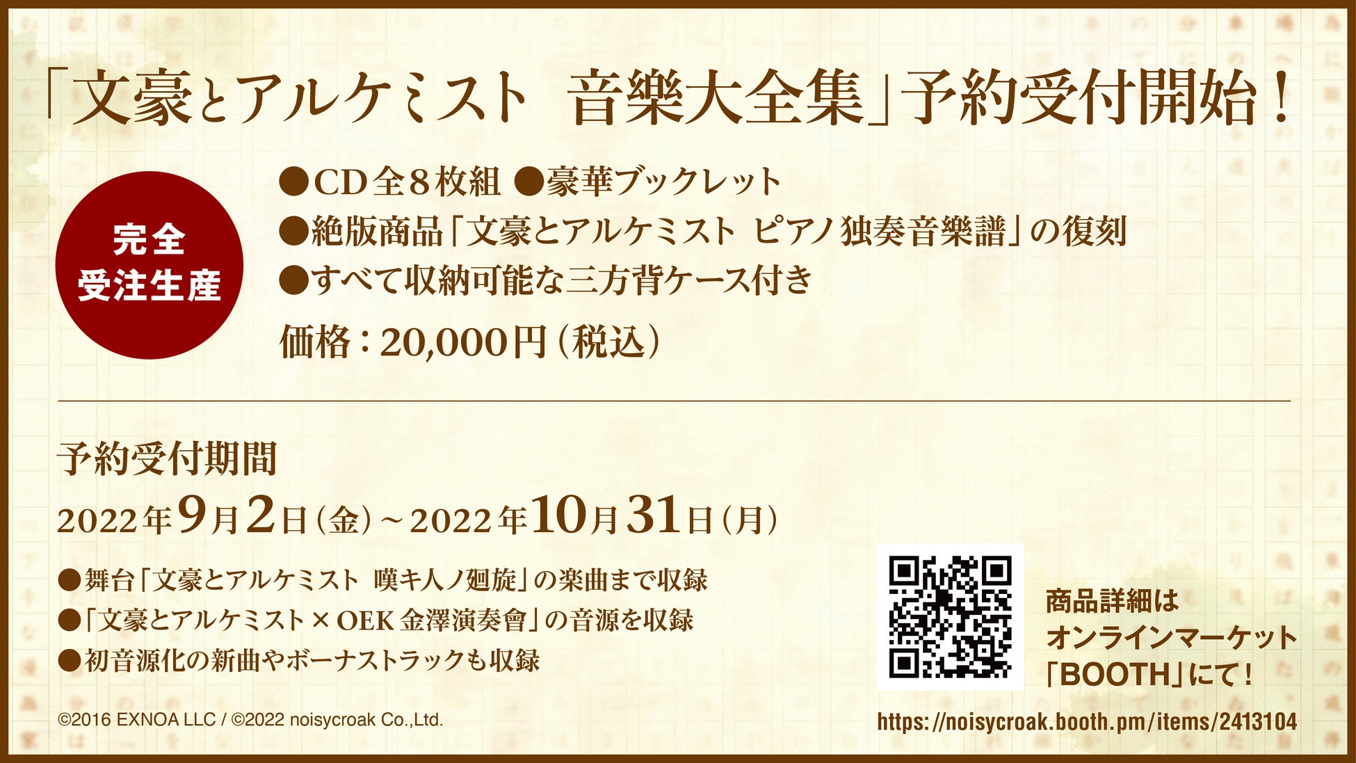 メインテーマ「文豪とアルケミスト」のオーケストラスコア掲載を含む、読み応えたっぷりの内容でお届けします。
