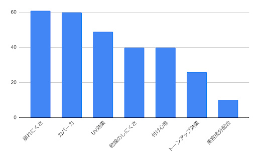 調査の結果、「崩れにくさ(61名)」「カバー力(60名)」を重視する人が多いことがわかりました。つづいて「UVカット効果(49名)」が重視されていました。