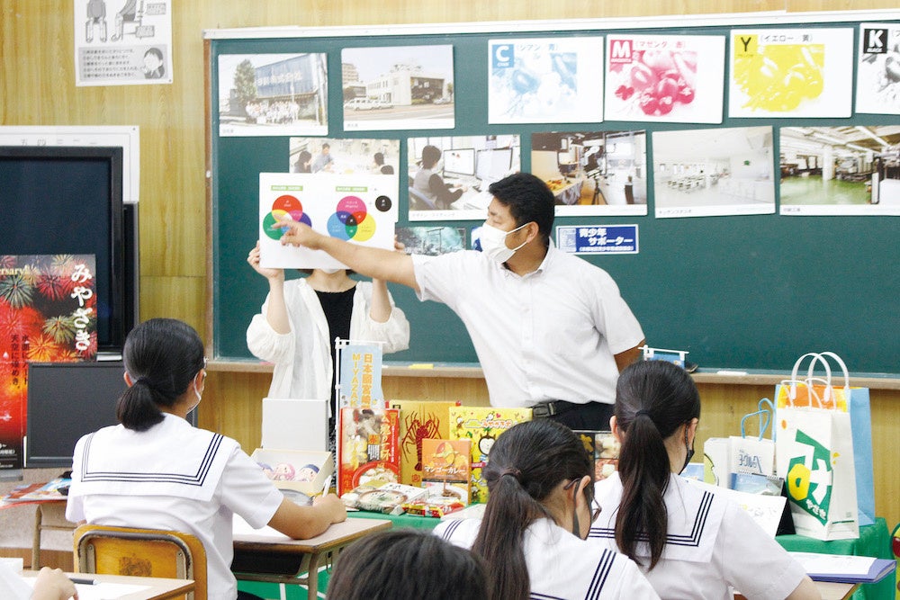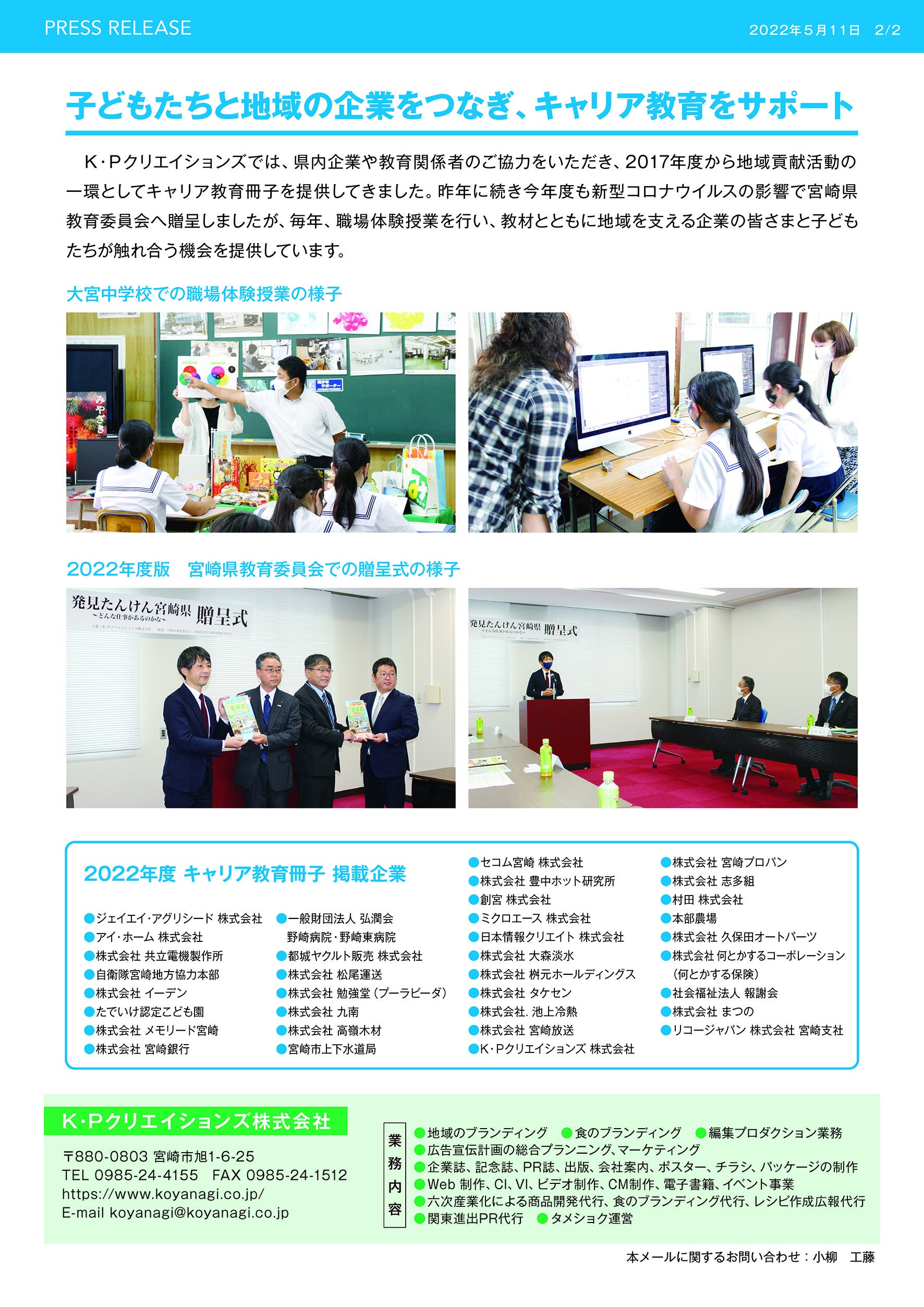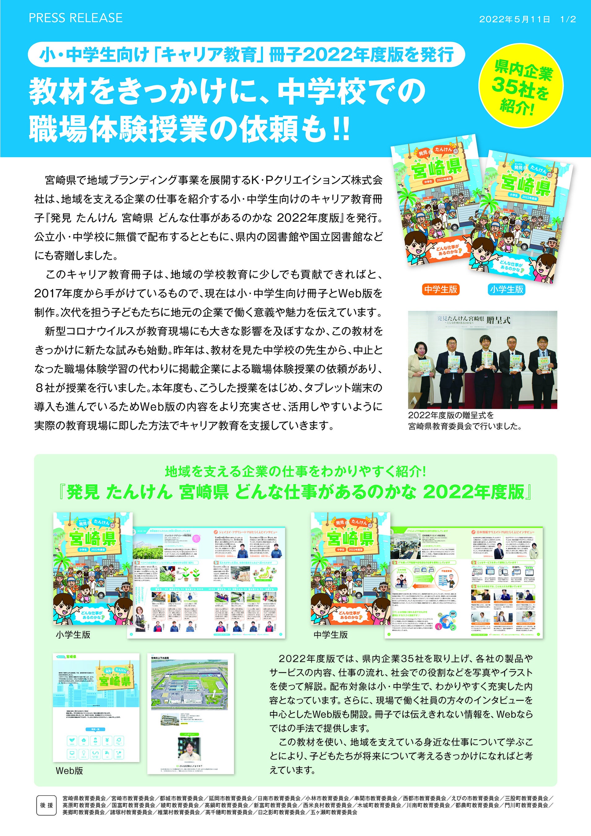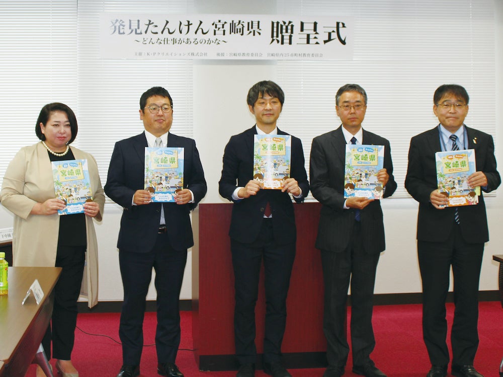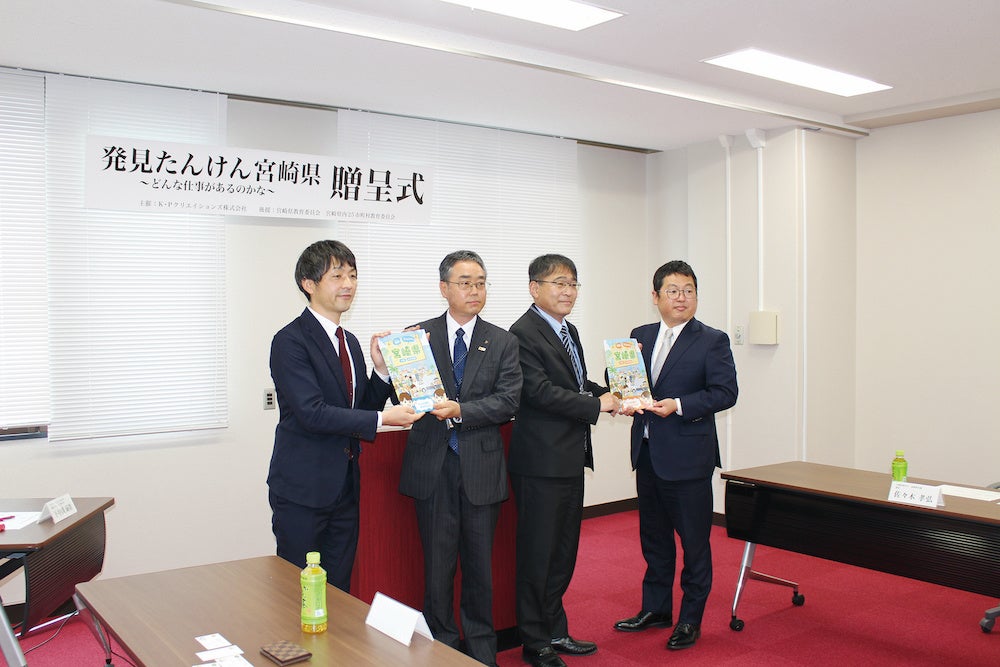 K・Pクリエイションズでは、県内企業や教育関係者のご協力をいただき、2017年度から地域貢献活動の一環としてキャリア教育冊子を提供してきました。昨年に続き今年度も新型コロナウイルスの影響で宮崎県教育委員会へ贈呈しましたが、毎年、職場体験授業を行い、教材とともに地域を支える企業の皆さまと子どもたちが触れ合う機会を提供しています。