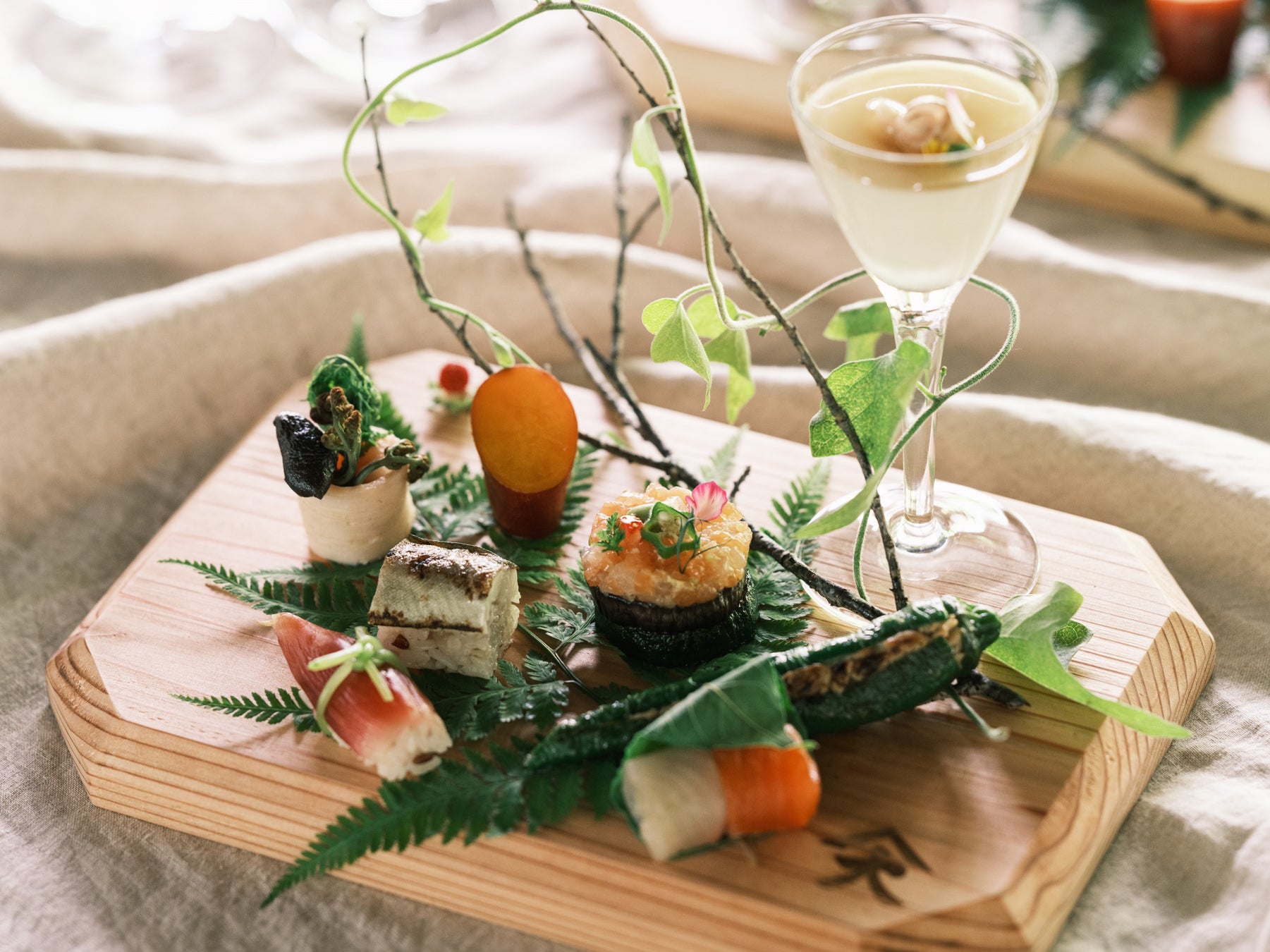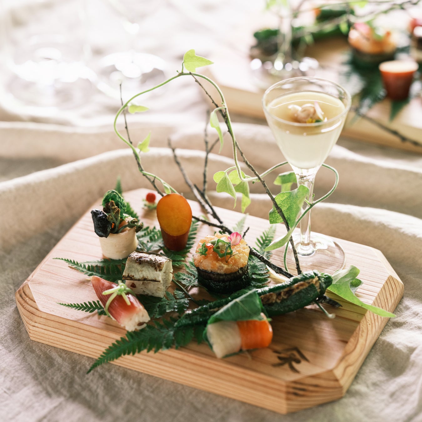 また最初に振舞われる「祝い膳」は、今回のエシカルウエディングプロジェクトのために小菅村の間伐材を使用し、村でつくられた「折敷(おしき)」の上に盛られご提供されます(結婚式にご参列された方は引き出物として持ち帰りいただけます)。