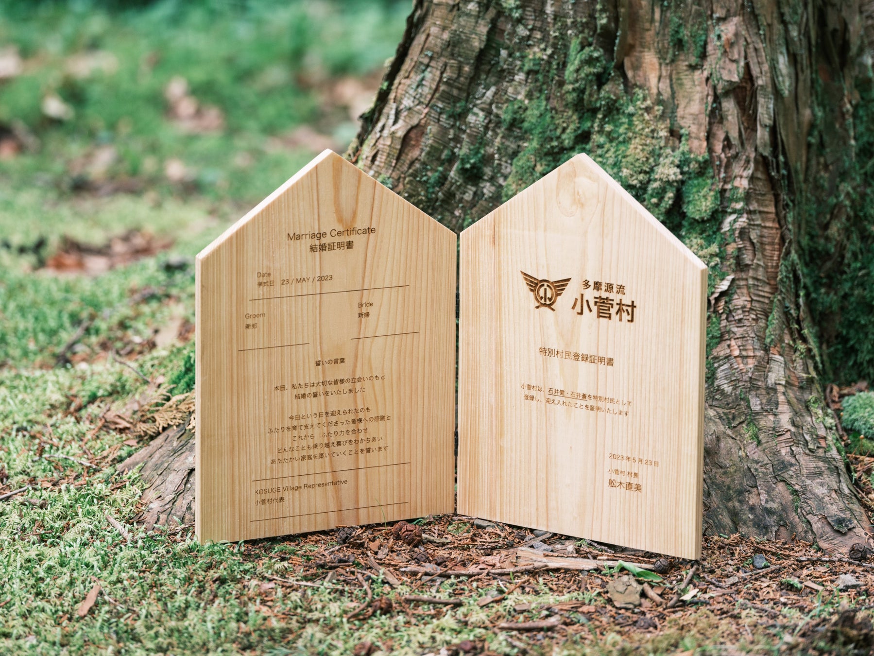 「結婚証明書」も村人の手により、小菅村の間伐材を使用してオリジナルで制作いたしました。「結婚証明書」には村人代表がサインをする欄を設けており、必ず村人が一人立ち合い、二人を祝福する約束となっています。またここで挙式を行ったおふたりは特別村民として、村の役場に登録されます。その「特別村民登録証」に役場で押印をいただくまでが、挙式の流れになっています。