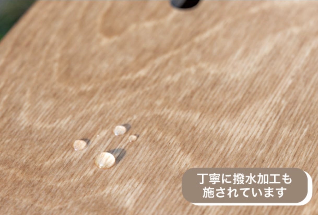 天板部分は職人により一つ一つ丁寧にハンドメイドで作られています。天板には天然木の白樺を使用。製造工程の最後にUVコーティング加工を施しているので耐候性にも優れています。アウトドアからインドアまで多くの場面で気兼ねなく使用できます。