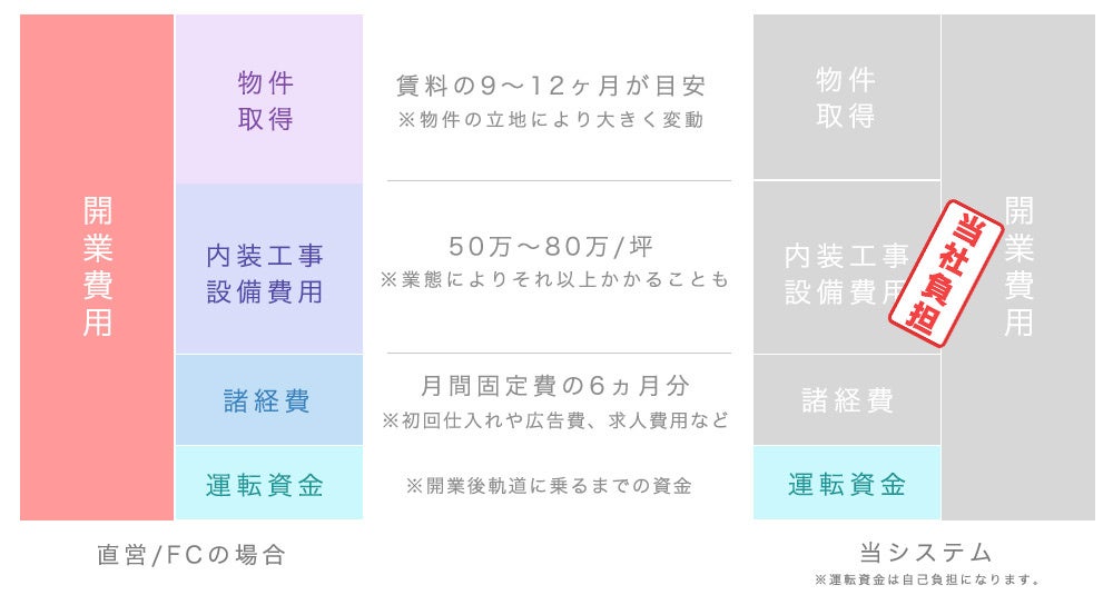 ムジャキフーズのトラスト方式では、この初期費用を準備する必要がなく、開業後の運営資金のみで自分のお店を持つことができます。