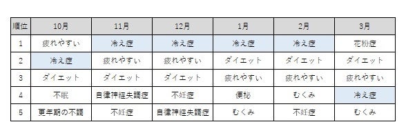 また、年間を通じて「疲れやすい」が上位にランクイン。疲れ・だるさは幅広い年代の共通のお悩みといえます。