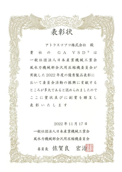 アトラスコプコ株式会社(本社:東京都港区 代表トーマスオスタグレン)コンプレッサ事業本部において、新製品・インバータコンプレッサ「GA VSDs」が2022年11月17日、一般社団法人日本産業機械工業会 汎用圧縮機委員会より2022年度の優秀製品を受賞しました。