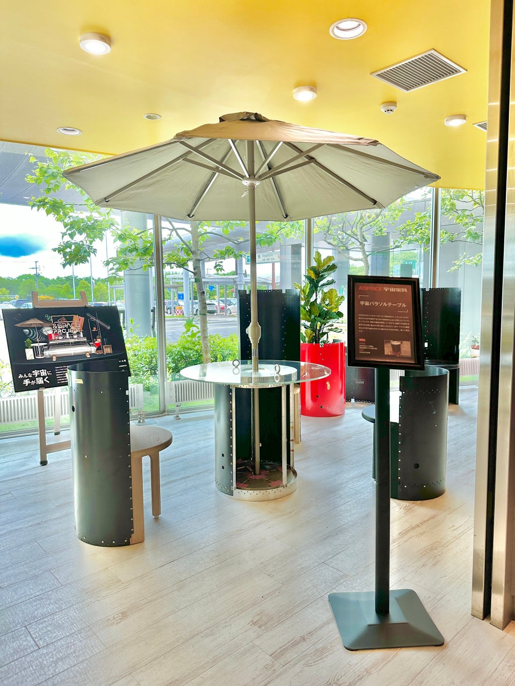 上:展示スペース全景/中:宇宙タンクベンチ/下:宇宙パラソルテーブル